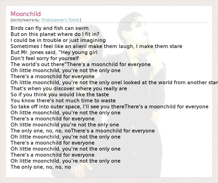 Birds can fly and fish can swim But on this planet where do I fit in? I could be in trouble or just imagining Sometimes I feel like an alienI make them laugh, I make them stare But Mr. Jones said, "Hey young girl Don't feel sorry for yourself The world's out there"There's a moonchild for everyone Oh little moonchild, you're not the only one There's a moonchild for everyone Oh little moonchild, you're not the only oneI looked at the world from another star That's when you discover where you really are So if you think you would like the taste You know there's not much time to waste So take off into outer space, I'll see you thereThere's a moonchild for everyone Oh little moonchild, you're not the only one There's a moonchild for everyone Oh little moonchild you're not the only one The only one, no, no, noThere's a moonchild for everyone Oh little moonchild, you're not the only one There's a moonchild for everyone Oh little moonchild, you're not the only one There's a moonchild for everyone Oh little moonchild, you're not the only one The only one, no, no, no