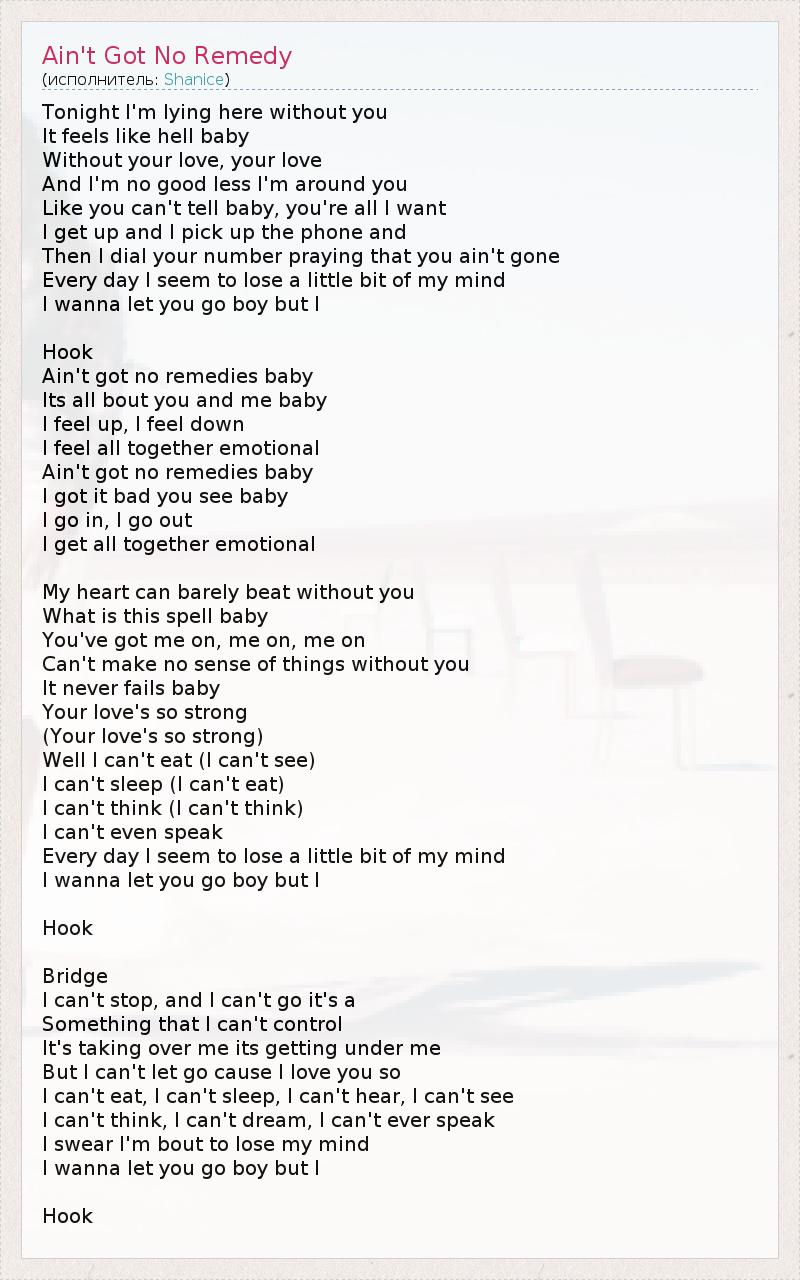 Tonight I'm lying here without you It feels like hell baby Without your love, your love And I'm no good less I'm around you Like you can't tell baby, you're all I want I get up and I pick up the phone and Then I dial your number praying that you ain't gone Every day I seem to lose a little bit of my mind I wanna let you go boy but I Hook Ain't got no remedies baby Its all bout you and me baby I feel up, I feel down I feel all together emotional Ain't got no remedies baby I got it bad you see baby I go in, I go out I get all together emotional My heart can barely beat without you What is this spell baby You've got me on, me on, me on Can't make no sense of things without you It never fails baby Your love's so strong (Your love's so strong) Well I can't eat (I can't see) I can't sleep (I can't eat) I can't think (I can't think) I can't even speak Every day I seem to lose a little bit of my mind I wanna let you go boy but I Hook Bridge I can't stop, and I can't go it's a Something that I can't control It's taking over me its getting under me But I can't let go cause I love you so I can't eat, I can't sleep, I can't hear, I can't see I can't think, I can't dream, I can't ever speak I swear I'm bout to lose my mind I wanna let you go boy but I Hook