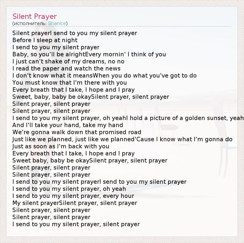 Silent prayerI send to you my silent prayer Before I sleep at night I send to you my silent prayer Baby, so you'll be alrightEvery mornin' I think of you I just can't shake of my dreams, no no I read the paper and watch the news I don't know what it meansWhen you do what you've got to do You must know that I'm there with you Every breath that I take, I hope and I pray Sweet, baby, baby be okaySilent prayer, silent prayer Silent prayer, silent prayer Silent prayer, silent prayer I send to you my silent prayer, oh yeahI hold a picture of a golden sunset, yeah And I'll take your hand, take my hand We're gonna walk down that promised road Just like we planned, just like we planned'Cause I know what I'm gonna do Just as soon as I'm back with you Every breath that I take, I hope and I pray Sweet baby, baby be okaySilent prayer, silent prayer Silent prayer, silent prayer Silent prayer, silent prayer I send to you my silent prayerI send to you my silent prayer I send to you my silent prayer, oh yeah I send to you my silent prayer, every hour My silent prayerSilent prayer, silent prayer Silent prayer, silent prayer Silent prayer, silent prayer I send to you my silent prayer, silent prayer