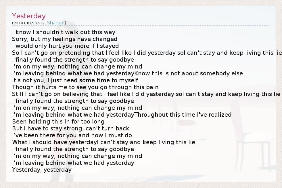 I know I shouldn't walk out this way Sorry, but my feelings have changed I would only hurt you more if I stayed So I can't go on pretending that I feel like I did yesterday soI can't stay and keep living this lie I finally found the strength to say goodbye I'm on my way, nothing can change my mind I'm leaving behind what we had yesterdayKnow this is not about somebody else It's not you, I just need some time to myself Though it hurts me to see you go through this pain Still I can't go on believing that I feel like I did yesterday soI can't stay and keep living this lie I finally found the strength to say goodbye I'm on my way, nothing can change my mind I'm leaving behind what we had yesterdayThroughout this time I've realized Been holding this in for too long But I have to stay strong, can't turn back I've been there for you and now I must do What I should have yesterdayI can't stay and keep living this lie I finally found the strength to say goodbye I'm on my way, nothing can change my mind I'm leaving behind what we had yesterday Yesterday, yesterday