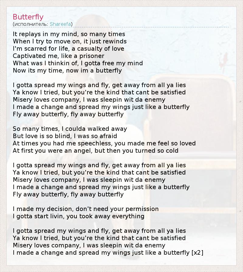 It replays in my mind, so many times When I try to move on, it just rewinds I'm scarred for life, a casualty of love Captivated me, like a prisoner What was I thinkin of, I gotta free my mind Now its my time, now im a butterfly I gotta spread my wings and fly, get away from all ya lies Ya know I tried, but you're the kind that cant be satisfied Misery loves company, I was sleepin wit da enemy I made a change and spread my wings just like a butterfly Fly away butterfly, fly away butterfly So many times, I coulda walked away But love is so blind, I was so afraid At times you had me speechless, you made me feel so loved At first you were an angel, but then you turned so cold I gotta spread my wings and fly, get away from all ya lies Ya know I tried, but you're the kind that cant be satisfied Misery loves company, I was sleepin wit da enemy I made a change and spread my wings just like a butterfly Fly away butterfly, fly away butterfly I made my decision, don't need your permission I gotta start livin, you took away everything I gotta spread my wings and fly, get away from all ya lies Ya know I tried, but you're the kind that cant be satisfied Misery loves company, I was sleepin wit da enemy I made a change and spread my wings just like a butterfly [x2]