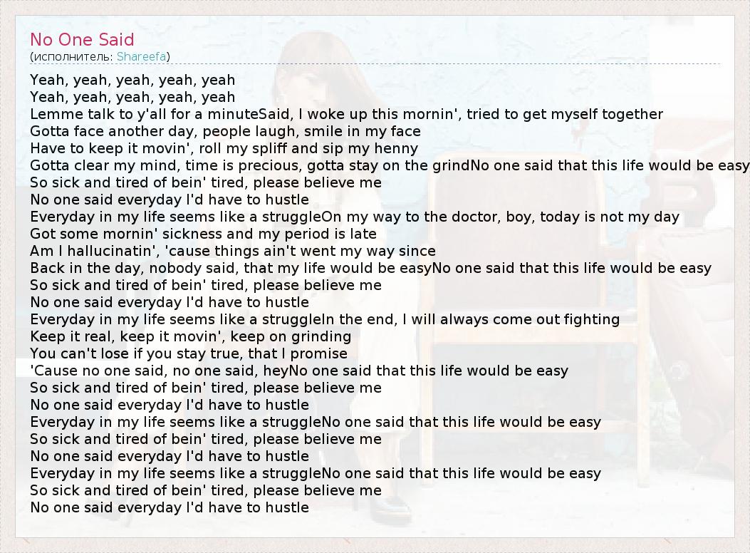 Yeah, yeah, yeah, yeah, yeah Yeah, yeah, yeah, yeah, yeah Lemme talk to y'all for a minuteSaid, I woke up this mornin', tried to get myself together Gotta face another day, people laugh, smile in my face Have to keep it movin', roll my spliff and sip my henny Gotta clear my mind, time is precious, gotta stay on the grindNo one said that this life would be easy So sick and tired of bein' tired, please believe me No one said everyday I'd have to hustle Everyday in my life seems like a struggleOn my way to the doctor, boy, today is not my day Got some mornin' sickness and my period is late Am I hallucinatin', 'cause things ain't went my way since Back in the day, nobody said, that my life would be easyNo one said that this life would be easy So sick and tired of bein' tired, please believe me No one said everyday I'd have to hustle Everyday in my life seems like a struggleIn the end, I will always come out fighting Keep it real, keep it movin', keep on grinding You can't lose if you stay true, that I promise 'Cause no one said, no one said, heyNo one said that this life would be easy So sick and tired of bein' tired, please believe me No one said everyday I'd have to hustle Everyday in my life seems like a struggleNo one said that this life would be easy So sick and tired of bein' tired, please believe me No one said everyday I'd have to hustle Everyday in my life seems like a struggleNo one said that this life would be easy So sick and tired of bein' tired, please believe me No one said everyday I'd have to hustle