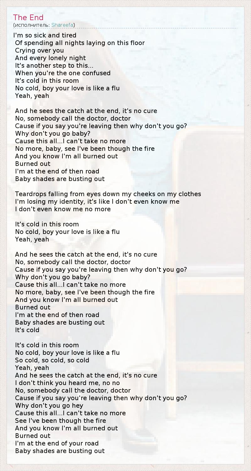 I'm so sick and tired Of spending all nights laying on this floor Crying over you And every lonely night It's another step to this... When you're the one confused It's cold in this room No cold, boy your love is like a flu Yeah, yeah And he sees the catch at the end, it's no cure No, somebody call the doctor, doctor Cause if you say you're leaving then why don't you go? Why don't you go baby? Cause this all...I can't take no more No more, baby, see I've been though the fire And you know I'm all burned out Burned out I'm at the end of then road Baby shades are busting out Teardrops falling from eyes down my cheeks on my clothes I'm losing my identity, it's like I don't even know me I don't even know me no more It's cold in this room No cold, boy your love is like a flu Yeah, yeah And he sees the catch at the end, it's no cure No, somebody call the doctor, doctor Cause if you say you're leaving then why don't you go? Why don't you go baby? Cause this all...I can't take no more No more, baby, see I've been though the fire And you know I'm all burned out Burned out I'm at the end of then road Baby shades are busting out It's cold It's cold in this room No cold, boy your love is like a flu So cold, so cold, so cold Yeah, yeah And he sees the catch at the end, it's no cure I don't think you heard me, no no No, somebody call the doctor, doctor Cause if you say you're leaving then why don't you go? Why don't you go hey Cause this all...I can't take no more See I've been though the fire And you know I'm all burned out Burned out I'm at the end of your road Baby shades are busting out