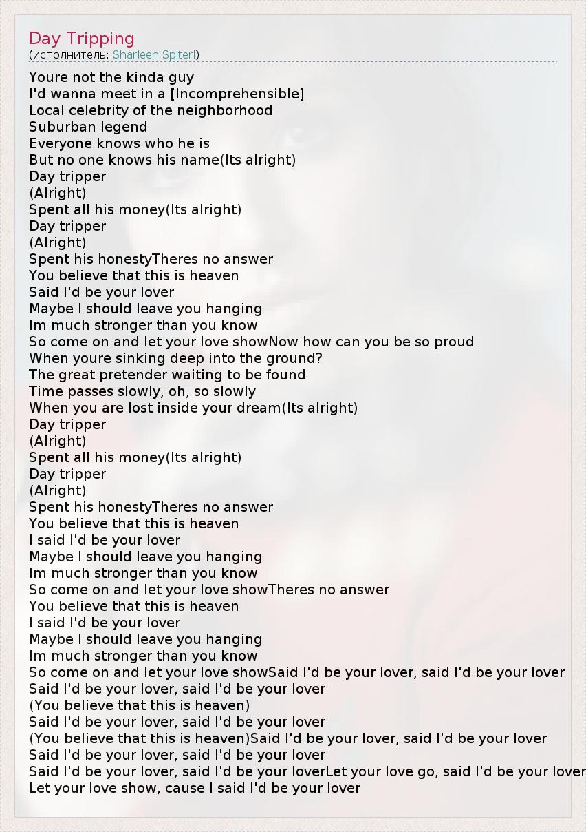 Youre not the kinda guy I'd wanna meet in a [Incomprehensible] Local celebrity of the neighborhood Suburban legend Everyone knows who he is But no one knows his name(Its alright) Day tripper (Alright) Spent all his money(Its alright) Day tripper (Alright) Spent his honestyTheres no answer You believe that this is heaven Said I'd be your lover Maybe I should leave you hanging Im much stronger than you know So come on and let your love showNow how can you be so proud When youre sinking deep into the ground? The great pretender waiting to be found Time passes slowly, oh, so slowly When you are lost inside your dream(Its alright) Day tripper (Alright) Spent all his money(Its alright) Day tripper (Alright) Spent his honestyTheres no answer You believe that this is heaven I said I'd be your lover Maybe I should leave you hanging Im much stronger than you know So come on and let your love showTheres no answer You believe that this is heaven I said I'd be your lover Maybe I should leave you hanging Im much stronger than you know So come on and let your love showSaid I'd be your lover, said I'd be your lover Said I'd be your lover, said I'd be your lover (You believe that this is heaven) Said I'd be your lover, said I'd be your lover (You believe that this is heaven)Said I'd be your lover, said I'd be your lover Said I'd be your lover, said I'd be your lover Said I'd be your lover, said I'd be your loverLet your love go, said I'd be your lover Let your love show, cause I said I'd be your lover