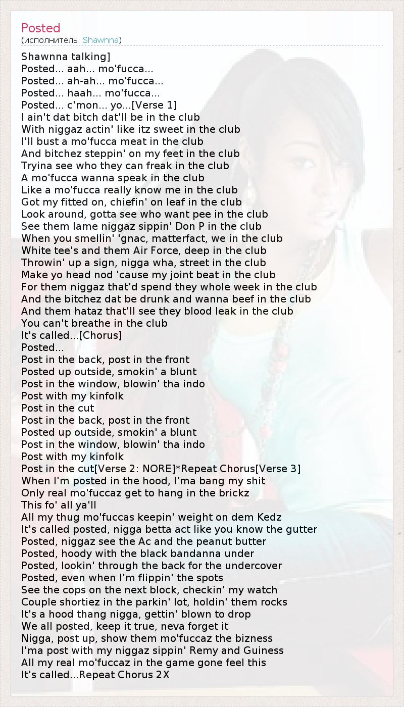 Shawnna talking] Posted... aah... mo'fucca... Posted... ah-ah... mo'fucca... Posted... haah... mo'fucca... Posted... c'mon... yo...[Verse 1] I ain't dat bitch dat'll be in the club With niggaz actin' like itz sweet in the club I'll bust a mo'fucca meat in the club And bitchez steppin' on my feet in the club Tryina see who they can freak in the club A mo'fucca wanna speak in the club Like a mo'fucca really know me in the club Got my fitted on, chiefin' on leaf in the club Look around, gotta see who want pee in the club See them lame niggaz sippin' Don P in the club When you smellin' 'gnac, matterfact, we in the club White tee's and them Air Force, deep in the club Throwin' up a sign, nigga wha, street in the club Make yo head nod 'cause my joint beat in the club For them niggaz that'd spend they whole week in the club And the bitchez dat be drunk and wanna beef in the club And them hataz that'll see they blood leak in the club You can't breathe in the club It's called...[Chorus] Posted... Post in the back, post in the front Posted up outside, smokin' a blunt Post in the window, blowin' tha indo Post with my kinfolk Post in the cut Post in the back, post in the front Posted up outside, smokin' a blunt Post in the window, blowin' tha indo Post with my kinfolk Post in the cut[Verse 2: NORE]*Repeat Chorus[Verse 3] When I'm posted in the hood, I'ma bang my shit Only real mo'fuccaz get to hang in the brickz This fo' all ya'll All my thug mo'fuccas keepin' weight on dem Kedz It's called posted, nigga betta act like you know the gutter Posted, niggaz see the Ac and the peanut butter Posted, hoody with the black bandanna under Posted, lookin' through the back for the undercover Posted, even when I'm flippin' the spots See the cops on the next block, checkin' my watch Couple shortiez in the parkin' lot, holdin' them rocks It's a hood thang nigga, gettin' blown to drop We all posted, keep it true, neva forget it Nigga, post up, show them mo'fuccaz the bizness I'ma post with my niggaz sippin' Remy and Guiness All my real mo'fuccaz in the game gone feel this It's called...Repeat Chorus 2X