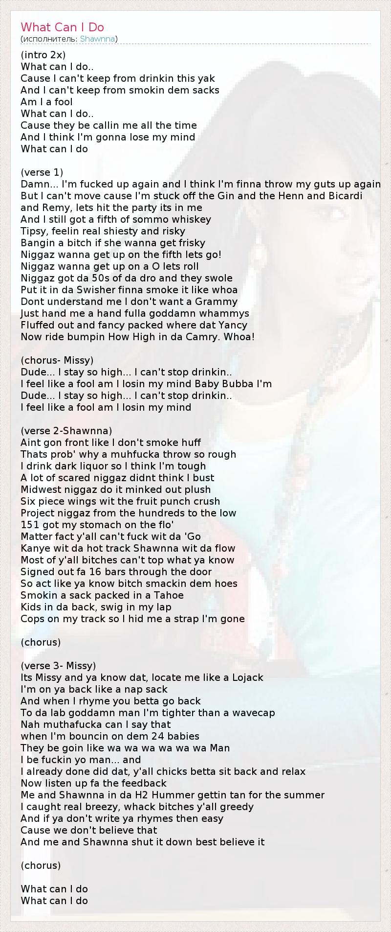 (intro 2x) What can I do.. Cause I can't keep from drinkin this yak And I can't keep from smokin dem sacks Am I a fool What can I do.. Cause they be callin me all the time And I think I'm gonna lose my mind What can I do (verse 1) Damn... I'm fucked up again and I think I'm finna throw my guts up again But I can't move cause I'm stuck off the Gin and the Henn and Bicardi and Remy, lets hit the party its in me And I still got a fifth of sommo whiskey Tipsy, feelin real shiesty and risky Bangin a bitch if she wanna get frisky Niggaz wanna get up on the fifth lets go! Niggaz wanna get up on a O lets roll Niggaz got da 50s of da dro and they swole Put it in da Swisher finna smoke it like whoa Dont understand me I don't want a Grammy Just hand me a hand fulla goddamn whammys Fluffed out and fancy packed where dat Yancy Now ride bumpin How High in da Camry. Whoa! (chorus- Missy) Dude... I stay so high... I can't stop drinkin.. I feel like a fool am I losin my mind Baby Bubba I'm Dude... I stay so high... I can't stop drinkin.. I feel like a fool am I losin my mind (verse 2-Shawnna) Aint gon front like I don't smoke huff Thats prob' why a muhfucka throw so rough I drink dark liquor so I think I'm tough A lot of scared niggaz didnt think I bust Midwest niggaz do it minked out plush Six piece wings wit the fruit punch crush Project niggaz from the hundreds to the low 151 got my stomach on the flo' Matter fact y'all can't fuck wit da 'Go Kanye wit da hot track Shawnna wit da flow Most of y'all bitches can't top what ya know Signed out fa 16 bars through the door So act like ya know bitch smackin dem hoes Smokin a sack packed in a Tahoe Kids in da back, swig in my lap Cops on my track so I hid me a strap I'm gone (chorus) (verse 3- Missy) Its Missy and ya know dat, locate me like a Lojack I'm on ya back like a nap sack And when I rhyme you betta go back To da lab goddamn man I'm tighter than a wavecap Nah muthafucka can I say that when I'm bouncin on dem 24 babies They be goin like wa wa wa wa wa wa Man I be fuckin yo man... and I already done did dat, y'all chicks betta sit back and relax Now listen up fa the feedback Me and Shawnna in da H2 Hummer gettin tan for the summer I caught real breezy, whack bitches y'all greedy And if ya don't write ya rhymes then easy Cause we don't believe that And me and Shawnna shut it down best believe it (chorus) What can I do What can I do