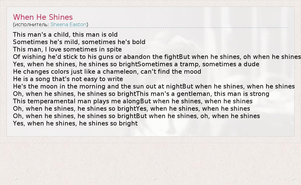 This man's a child, this man is old Sometimes he's mild, sometimes he's bold This man, I love sometimes in spite Of wishing he'd stick to his guns or abandon the fightBut when he shines, oh when he shines Yes, when he shines, he shines so brightSometimes a tramp, sometimes a dude He changes colors just like a chameleon, can't find the mood He is a song that's not easy to write He's the moon in the morning and the sun out at nightBut when he shines, when he shines Oh, when he shines, he shines so brightThis man's a gentleman, this man is strong This temperamental man plays me alongBut when he shines, when he shines Oh, when he shines, he shines so brightYes, when he shines, when he shines Oh, when he shines, he shines so brightBut when he shines, oh, when he shines Yes, when he shines, he shines so bright