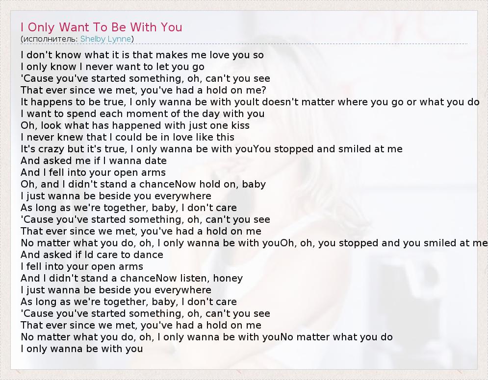 I don't know what it is that makes me love you so I only know I never want to let you go 'Cause you've started something, oh, can't you see That ever since we met, you've had a hold on me? It happens to be true, I only wanna be with youIt doesn't matter where you go or what you do I want to spend each moment of the day with you Oh, look what has happened with just one kiss I never knew that I could be in love like this It's crazy but it's true, I only wanna be with youYou stopped and smiled at me And asked me if I wanna date And I fell into your open arms Oh, and I didn't stand a chanceNow hold on, baby I just wanna be beside you everywhere As long as we're together, baby, I don't care 'Cause you've started something, oh, can't you see That ever since we met, you've had a hold on me No matter what you do, oh, I only wanna be with youOh, oh, you stopped and you smiled at me And asked if Id care to dance I fell into your open arms And I didn't stand a chanceNow listen, honey I just wanna be beside you everywhere As long as we're together, baby, I don't care 'Cause you've started something, oh, can't you see That ever since we met, you've had a hold on me No matter what you do, oh, I only wanna be with youNo matter what you do I only wanna be with you