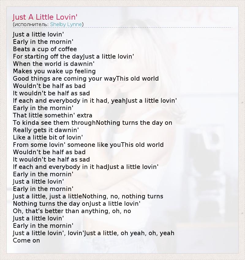Just a little lovin' Early in the mornin' Beats a cup of coffee For starting off the dayJust a little lovin' When the world is dawnin' Makes you wake up feeling Good things are coming your wayThis old world Wouldn't be half as bad It wouldn't be half as sad If each and everybody in it had, yeahJust a little lovin' Early in the mornin' That little somethin' extra To kinda see them throughNothing turns the day on Really gets it dawnin' Like a little bit of lovin' From some lovin' someone like youThis old world Wouldn't be half as bad It wouldn't be half as sad If each and everybody in it hadJust a little lovin' Early in the mornin' Just a little lovin' Early in the mornin' Just a little, just a littleNothing, no, nothing turns Nothing turns the day onJust a little lovin' Oh, that's better than anything, oh, no Just a little lovin' Early in the mornin' Just a little lovin', lovin'Just a little, oh yeah, oh, yeah Come on