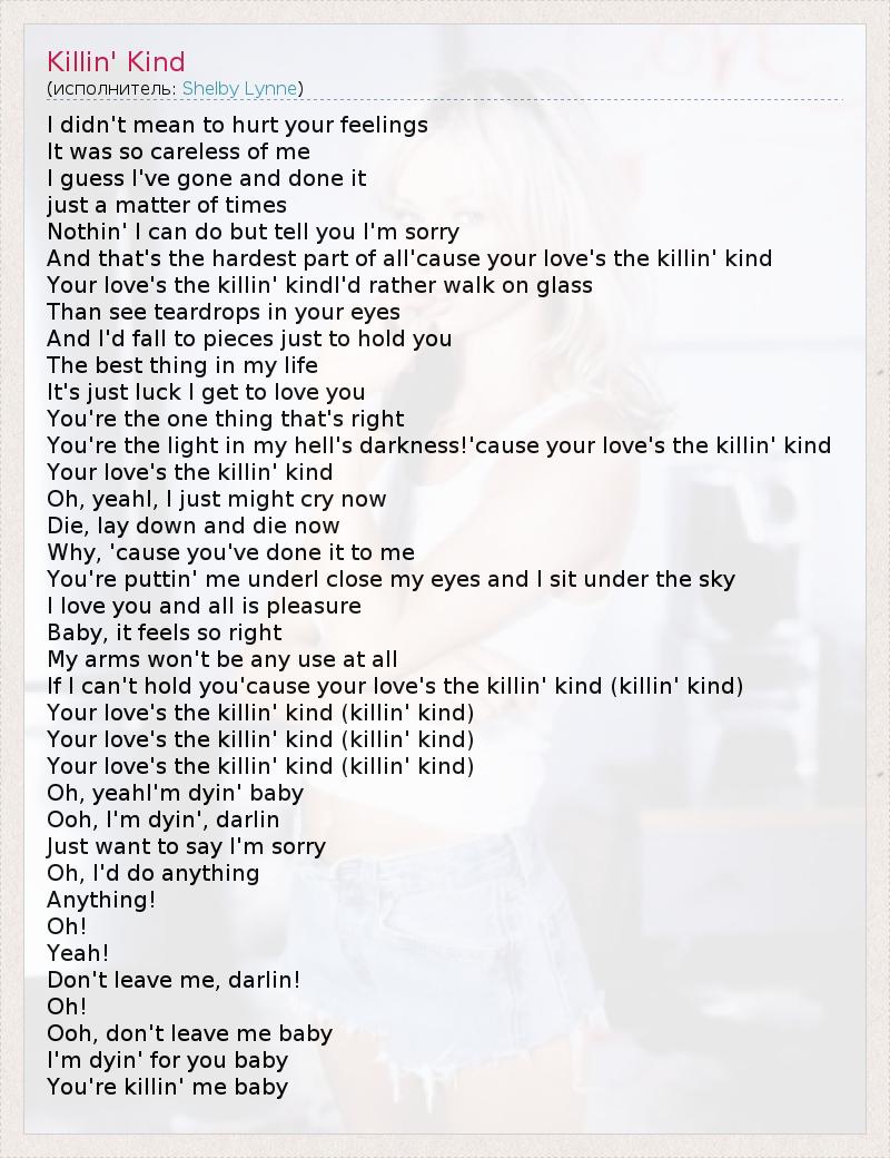 I didn't mean to hurt your feelings It was so careless of me I guess I've gone and done it just a matter of times Nothin' I can do but tell you I'm sorry And that's the hardest part of all'cause your love's the killin' kind Your love's the killin' kindI'd rather walk on glass Than see teardrops in your eyes And I'd fall to pieces just to hold you The best thing in my life It's just luck I get to love you You're the one thing that's right You're the light in my hell's darkness!'cause your love's the killin' kind Your love's the killin' kind Oh, yeahI, I just might cry now Die, lay down and die now Why, 'cause you've done it to me You're puttin' me underI close my eyes and I sit under the sky I love you and all is pleasure Baby, it feels so right My arms won't be any use at all If I can't hold you'cause your love's the killin' kind (killin' kind) Your love's the killin' kind (killin' kind) Your love's the killin' kind (killin' kind) Your love's the killin' kind (killin' kind) Oh, yeahI'm dyin' baby Ooh, I'm dyin', darlin Just want to say I'm sorry Oh, I'd do anything Anything! Oh! Yeah! Don't leave me, darlin! Oh! Ooh, don't leave me baby I'm dyin' for you baby You're killin' me baby