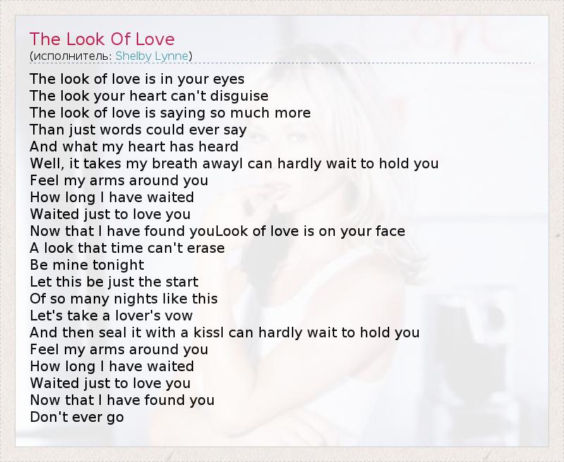 The look of love is in your eyes The look your heart can't disguise The look of love is saying so much more Than just words could ever say And what my heart has heard Well, it takes my breath awayI can hardly wait to hold you Feel my arms around you How long I have waited Waited just to love you Now that I have found youLook of love is on your face A look that time can't erase Be mine tonight Let this be just the start Of so many nights like this Let's take a lover's vow And then seal it with a kissI can hardly wait to hold you Feel my arms around you How long I have waited Waited just to love you Now that I have found you Don't ever go