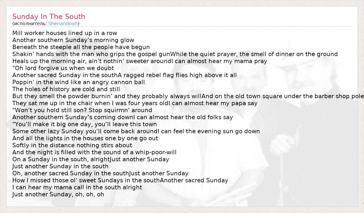 Oh, another sacred Sunday in the southJust another Sunday