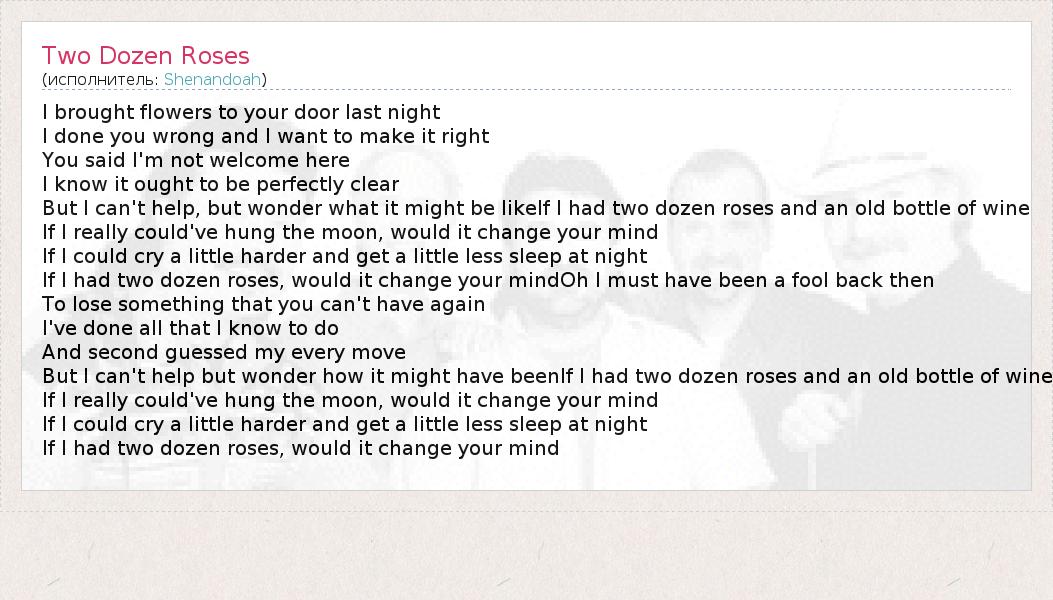 А как ты думаешь, о чем песня "Two Dozen Roses" ?