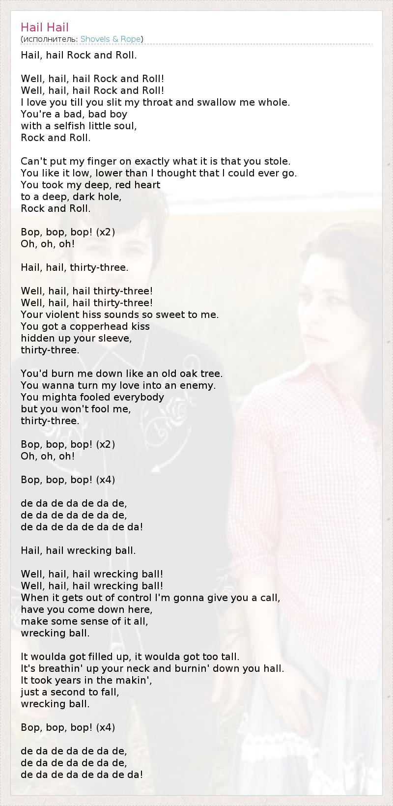Hail, hail Rock and Roll. Well, hail, hail Rock and Roll! Well, hail, hail Rock and Roll! I love you till you slit my throat and swallow me whole. You're a bad, bad boy with a selfish little soul, Rock and Roll. Can't put my finger on exactly what it is that you stole. You like it low, lower than I thought that I could ever go. You took my deep, red heart to a deep, dark hole, Rock and Roll. Bop, bop, bop! (x2) Oh, oh, oh! Hail, hail, thirty-three. Well, hail, hail thirty-three! Well, hail, hail thirty-three! Your violent hiss sounds so sweet to me. You got a copperhead kiss hidden up your sleeve, thirty-three. You'd burn me down like an old oak tree. You wanna turn my love into an enemy. You mighta fooled everybody but you won't fool me, thirty-three. Bop, bop, bop! (x2) Oh, oh, oh! Bop, bop, bop! (x4) de da de da de da de, de da de da de da de, de da de da de da de da! Hail, hail wrecking ball. Well, hail, hail wrecking ball! Well, hail, hail wrecking ball! When it gets out of control I'm gonna give you a call, have you come down here, make some sense of it all, wrecking ball. It woulda got filled up, it woulda got too tall. It's breathin' up your neck and burnin' down you hall. It took years in the makin', just a second to fall, wrecking ball. Bop, bop, bop! (x4) de da de da de da de, de da de da de da de, de da de da de da de da!
