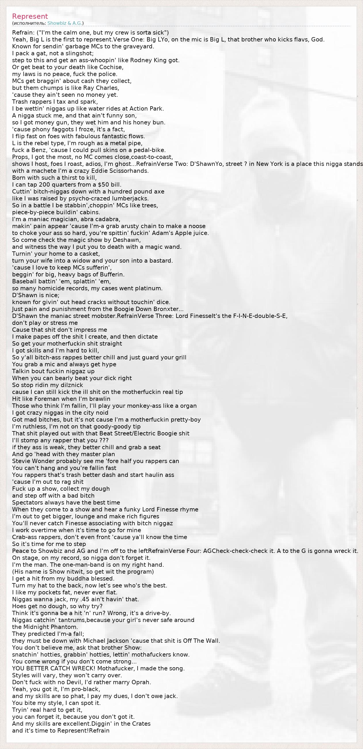 Это интересно:Showbiz & A.G. (так же известны как Show & A.G.) - американский хип-хоп дуэт из The Bronx, New York City. Showbiz - продюсер, A.G. (сокращенное от André the Giant) - рэпер. Впервые они засветились на альбоме Lord Finesse "Funky Technician" в 1990 году. Show & A.G. - участники легендарной команды Diggin' in the Crates (D.I.T.C.) вместе с Lord Finesse, Diamond D, Fat Joe, O.C., Buckwild и ныне покойным Big L. Первым полноценным релизом дуэта стал EP "Soul Clap", выпущенный в... продолжение