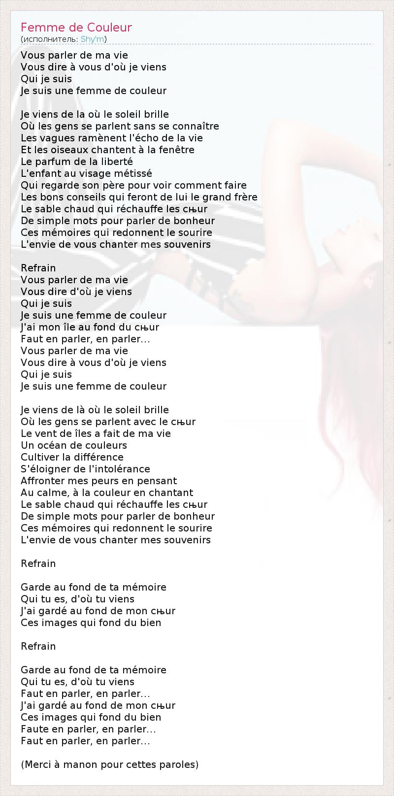 Vous parler de ma vie Vous dire à vous d'où je viens Qui je suis Je suis une femme de couleur Je viens de la où le soleil brille Où les gens se parlent sans se connaître Les vagues ramènent l'écho de la vie Et les oiseaux chantent à la fenêtre Le parfum de la liberté L'enfant au visage métissé Qui regarde son père pour voir comment faire Les bons conseils qui feront de lui le grand frère Le sable chaud qui réchauffe les cњur De simple mots pour parler de bonheur Ces mémoires qui redonnent le sourire L'envie de vous chanter mes souvenirs Refrain Vous parler de ma vie Vous dire d'où je viens Qui je suis Je suis une femme de couleur J'ai mon île au fond du cњur Faut en parler, en parler… Vous parler de ma vie Vous dire à vous d'où je viens Qui je suis Je suis une femme de couleur Je viens de là où le soleil brille Où les gens se parlent avec le cњur Le vent de îles a fait de ma vie Un océan de couleurs Cultiver la différence S'éloigner de l'intolérance Affronter mes peurs en pensant Au calme, à la couleur en chantant Le sable chaud qui réchauffe les cњur De simple mots pour parler de bonheur Ces mémoires qui redonnent le sourire L'envie de vous chanter mes souvenirs Refrain Garde au fond de ta mémoire Qui tu es, d'où tu viens J'ai gardé au fond de mon cњur Ces images qui fond du bien Refrain Garde au fond de ta mémoire Qui tu es, d'où tu viens Faut en parler, en parler… J'ai gardé au fond de mon cњur Ces images qui fond du bien Faute en parler, en parler… Faut en parler, en parler… (Merci à manon pour cettes paroles)
