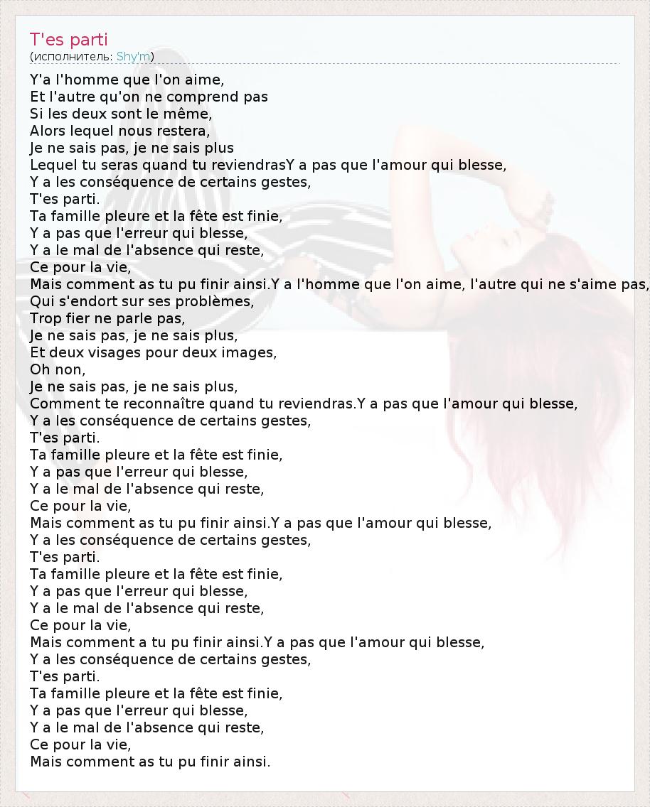 Y'a l'homme que l'on aime, Et l'autre qu'on ne comprend pas Si les deux sont le même, Alors lequel nous restera, Je ne sais pas, je ne sais plus Lequel tu seras quand tu reviendrasY a pas que l'amour qui blesse, Y a les conséquence de certains gestes, T'es parti. Ta famille pleure et la fête est finie, Y a pas que l'erreur qui blesse, Y a le mal de l'absence qui reste, Ce pour la vie, Mais comment as tu pu finir ainsi.Y a l'homme que l'on aime, l'autre qui ne s'aime pas, Qui s'endort sur ses problèmes, Trop fier ne parle pas, Je ne sais pas, je ne sais plus, Et deux visages pour deux images, Oh non, Je ne sais pas, je ne sais plus, Comment te reconnaître quand tu reviendras.Y a pas que l'amour qui blesse, Y a les conséquence de certains gestes, T'es parti. Ta famille pleure et la fête est finie, Y a pas que l'erreur qui blesse, Y a le mal de l'absence qui reste, Ce pour la vie, Mais comment as tu pu finir ainsi.Y a pas que l'amour qui blesse, Y a les conséquence de certains gestes, T'es parti. Ta famille pleure et la fête est finie, Y a pas que l'erreur qui blesse, Y a le mal de l'absence qui reste, Ce pour la vie, Mais comment a tu pu finir ainsi.Y a pas que l'amour qui blesse, Y a les conséquence de certains gestes, T'es parti. Ta famille pleure et la fête est finie, Y a pas que l'erreur qui blesse, Y a le mal de l'absence qui reste, Ce pour la vie, Mais comment as tu pu finir ainsi.