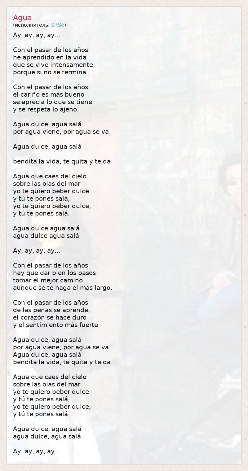 Сладкая вода, соленая вода(1) Ай, ай, ай, ай… По прошествии лет Я научился в жизни, Что нужно жить ярко, Потому, что если нет, она закончится По прошествии лет Нежность становится более глубокой Ценишь то, что имеешь И уважаешь чужое. Сладкая вода, соленая вода Из воды пришли, в воду уйдем Сладкая вода, соленая вода Благословенна жизнь, она отнимает у тебя и тебе дает Вода, которая падает с неба Над волнами моря Я тебя люблю пить, сладкая А ты, становишься соленой Я тебя люблю пить сладкой, А ты становишься соленой. Сладкая вода, соленая вода Сладкая вода, соленая вода Ай, ай, ай, ай… По прошествии лет, Нужно совершать хорошие поступки, Избирать самый лучший путь, Хотя он и самый длинный. По прошествии лет Боль учит, Сердце становится жестким, А чувства более сильными. Сладкая вода, соленая вода Из воды пришли, в воду уйдем Сладкая вода, соленая вода Благословенна жизнь, она отнимает у тебя и тебе дает Вода, которая падает с неба Над волнами моря Я тебя люблю пить, сладкая А ты, становишься соленой Я тебя люблю пить сладкой, А ты становишься соленой. Сладкая вода, соленая вода Сладкая вода, соленая вода Ай, ай, ай, ай… 1) буквально: «пресная вода», «морская вода». Перевод: Lesia © lyrsense.com