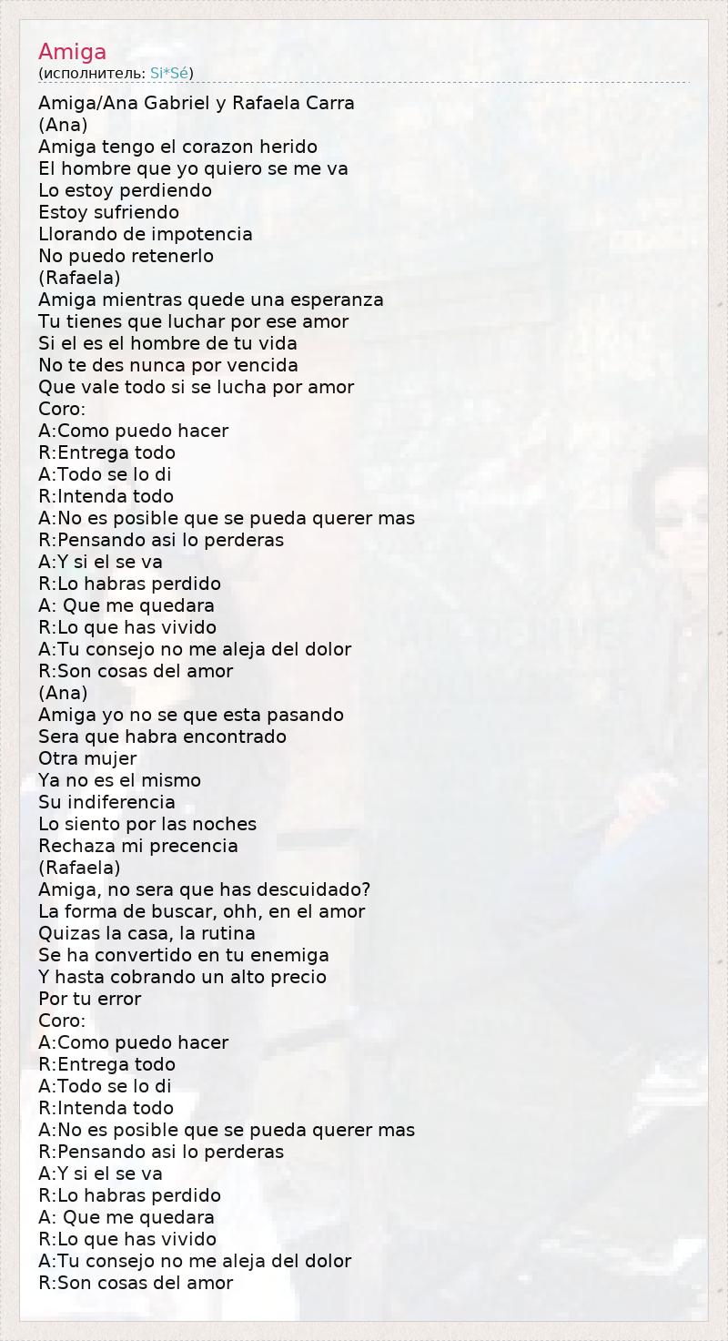 Amiga/Ana Gabriel y Rafaela Carra (Ana) Amiga tengo el corazon herido El hombre que yo quiero se me va Lo estoy perdiendo Estoy sufriendo Llorando de impotencia No puedo retenerlo (Rafaela) Amiga mientras quede una esperanza Tu tienes que luchar por ese amor Si el es el hombre de tu vida No te des nunca por vencida Que vale todo si se lucha por amor Coro: A:Como puedo hacer R:Entrega todo A:Todo se lo di R:Intenda todo A:No es posible que se pueda querer mas R:Pensando asi lo perderas A:Y si el se va R:Lo habras perdido A: Que me quedara R:Lo que has vivido A:Tu consejo no me aleja del dolor R:Son cosas del amor (Ana) Amiga yo no se que esta pasando Sera que habra encontrado Otra mujer Ya no es el mismo Su indiferencia Lo siento por las noches Rechaza mi precencia (Rafaela) Amiga, no sera que has descuidado? La forma de buscar, ohh, en el amor Quizas la casa, la rutina Se ha convertido en tu enemiga Y hasta cobrando un alto precio Por tu error Coro: A:Como puedo hacer R:Entrega todo A:Todo se lo di R:Intenda todo A:No es posible que se pueda querer mas R:Pensando asi lo perderas A:Y si el se va R:Lo habras perdido A: Que me quedara R:Lo que has vivido A:Tu consejo no me aleja del dolor R:Son cosas del amor