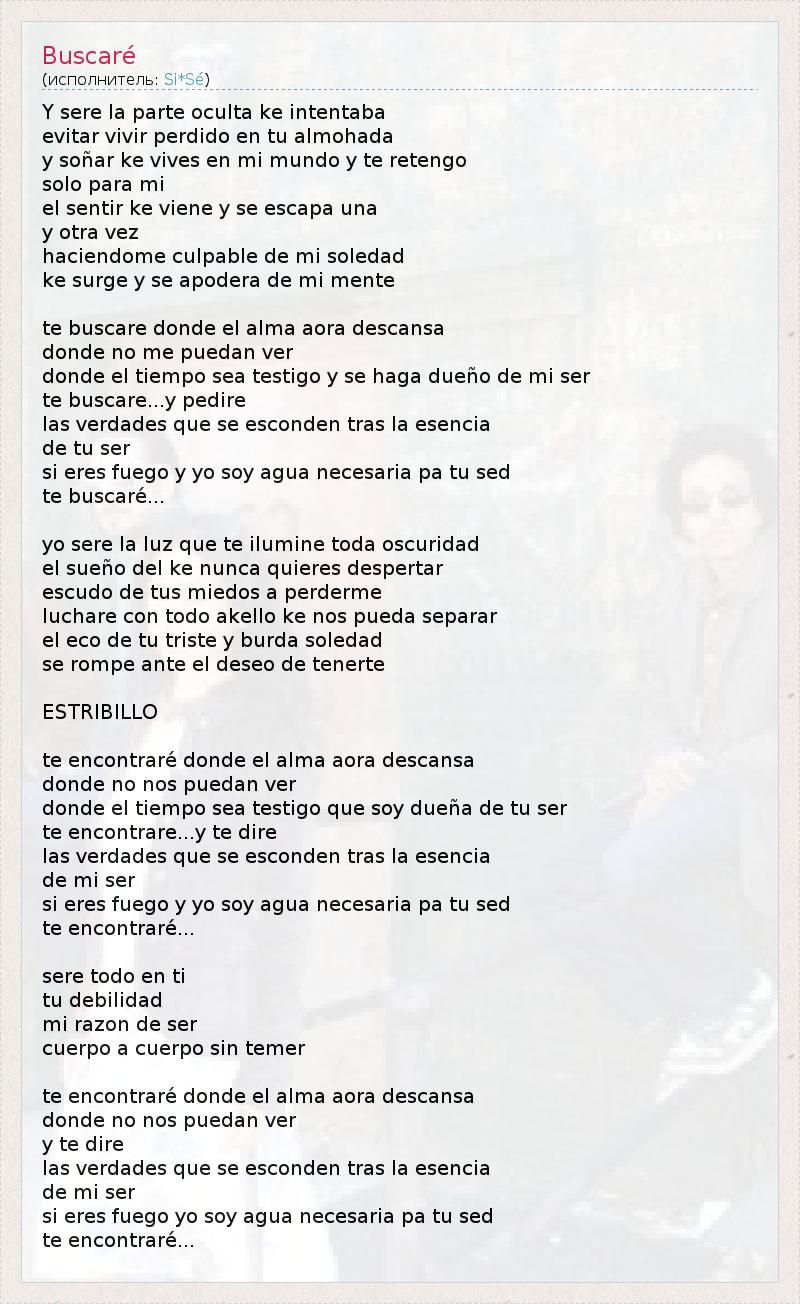 Y sere la parte oculta ke intentaba evitar vivir perdido en tu almohada y soñar ke vives en mi mundo y te retengo solo para mi el sentir ke viene y se escapa una y otra vez haciendome culpable de mi soledad ke surge y se apodera de mi mente te buscare donde el alma aora descansa donde no me puedan ver donde el tiempo sea testigo y se haga dueño de mi ser te buscare...y pedire las verdades que se esconden tras la esencia de tu ser si eres fuego y yo soy agua necesaria pa tu sed te buscaré... yo sere la luz que te ilumine toda oscuridad el sueño del ke nunca quieres despertar escudo de tus miedos a perderme luchare con todo akello ke nos pueda separar el eco de tu triste y burda soledad se rompe ante el deseo de tenerte ESTRIBILLO te encontraré donde el alma aora descansa donde no nos puedan ver donde el tiempo sea testigo que soy dueña de tu ser te encontrare...y te dire las verdades que se esconden tras la esencia de mi ser si eres fuego y yo soy agua necesaria pa tu sed te encontraré... sere todo en ti tu debilidad mi razon de ser cuerpo a cuerpo sin temer te encontraré donde el alma aora descansa donde no nos puedan ver y te dire las verdades que se esconden tras la esencia de mi ser si eres fuego yo soy agua necesaria pa tu sed te encontraré...