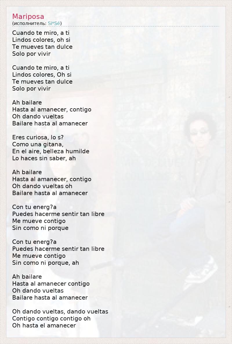 Cuando te miro, a ti Lindos colores, oh si Te mueves tan dulce Solo por vivir Cuando te miro, a ti Lindos colores, Oh si Te mueves tan dulce Solo por vivir Ah bailare Hasta al amanecer, contigo Oh dando vueltas Bailare hasta al amanecer Eres curiosa, lo s? Como una gitana, En el aire, belleza humilde Lo haces sin saber, ah Ah bailare Hasta al amanecer, contigo Oh dando vueltas oh Bailare hasta al amanecer Con tu energ?a Puedes hacerme sentir tan libre Me mueve contigo Sin como ni porque Con tu energ?a Puedes hacerme sentir tan libre Me mueve contigo Sin como ni porque, ah Ah bailare Hasta al amanecer contigo Oh dando vueltas Bailare hasta al amanecer Oh dando vueltas, dando vueltas Contigo contigo contigo oh Oh hasta el amanecer