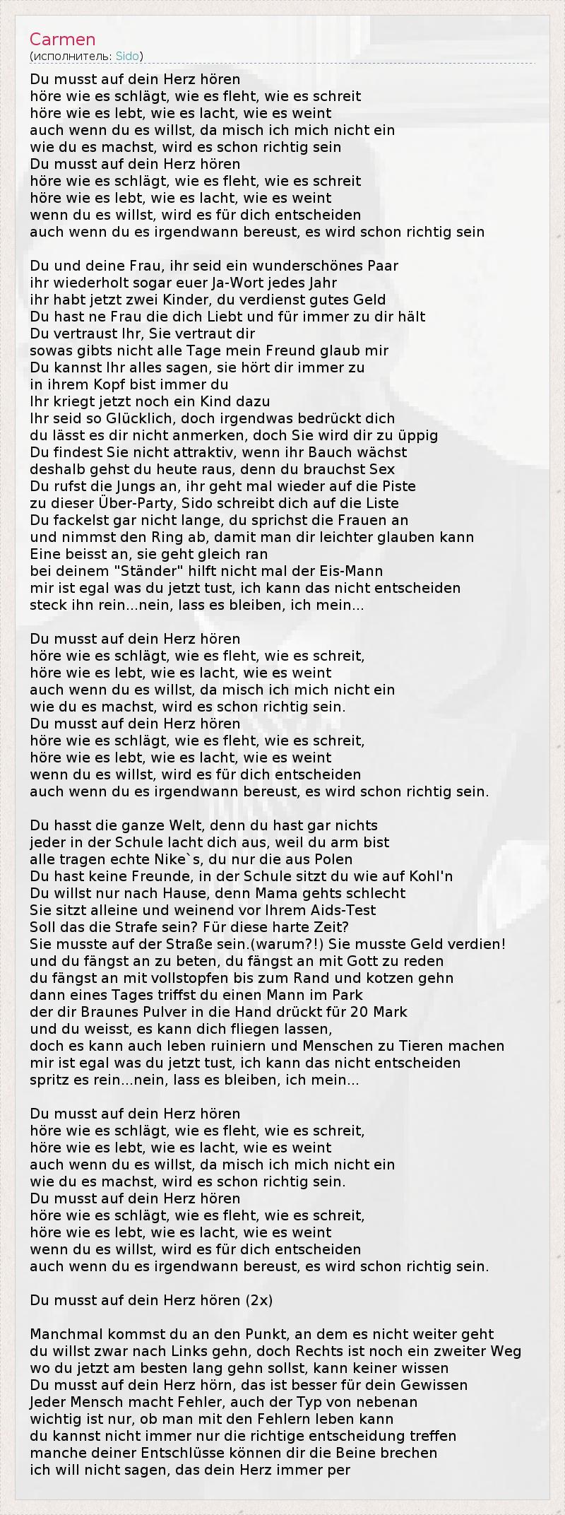 Это интересно:Sido родился 30 Ноября 1980 года в Берлине, настоящее имя Paul Wurdig. В 2001-2009 входил в немецкий лейбл Aggro Berlin.Sido отличается необычными агрессивными и провокационными текстами, но несмотря на это имеет лаконичный оттенок в голосе.Долгое время Sido вообще не снимал маску чтобы скрыть своё истинное лицо. Теперь он носит ее только как собственную визитную карточку.Sido рос с матерью и младшей... продолжение