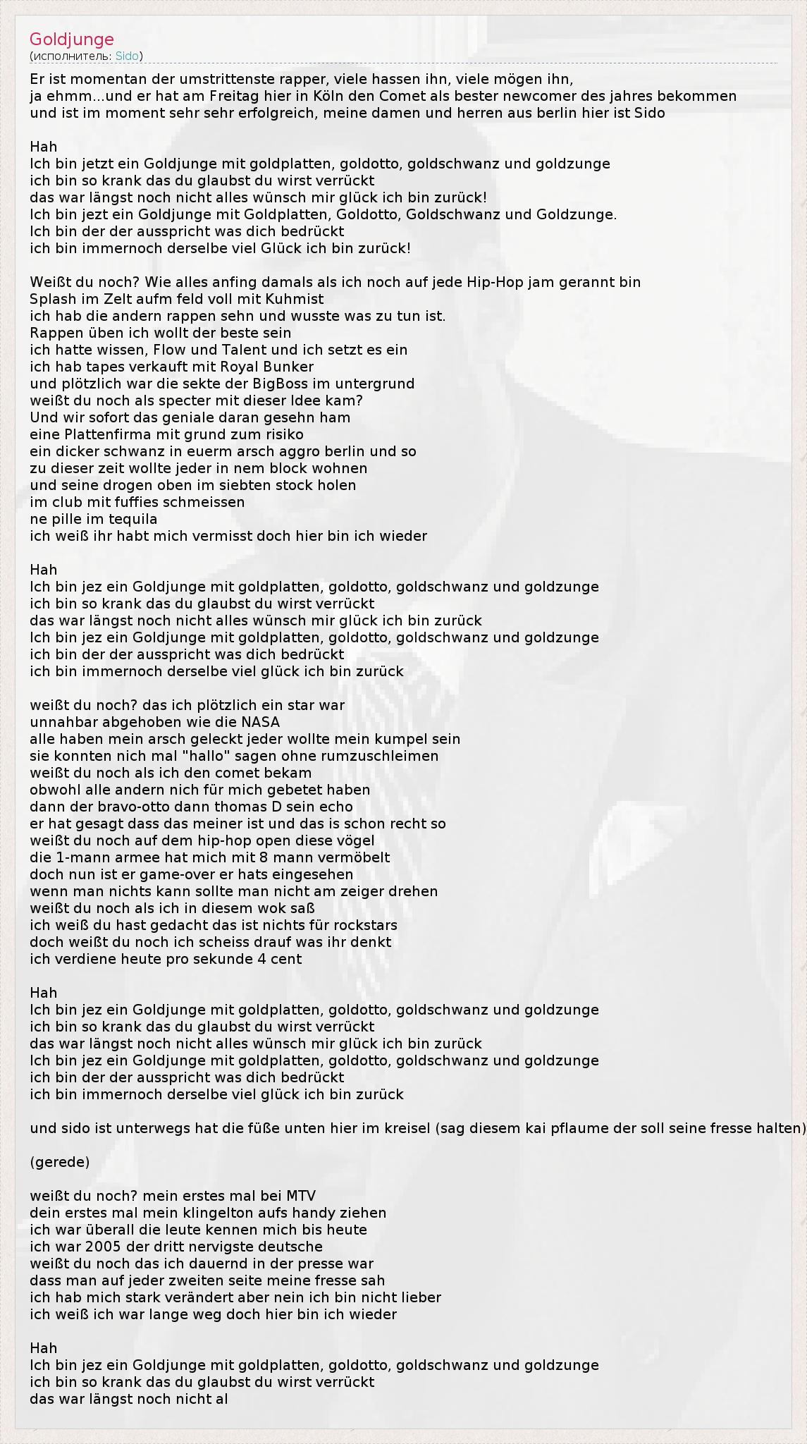 Ich bin jezt ein Goldjunge mit Goldplatten, Goldotto, Goldschwanz und Goldzunge.