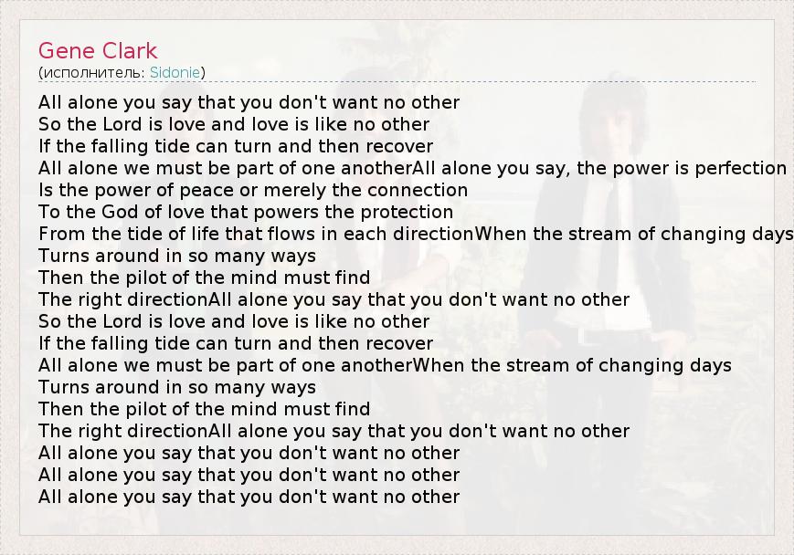 All alone you say that you don't want no other So the Lord is love and love is like no other If the falling tide can turn and then recover All alone we must be part of one anotherAll alone you say, the power is perfection Is the power of peace or merely the connection To the God of love that powers the protection From the tide of life that flows in each directionWhen the stream of changing days Turns around in so many ways Then the pilot of the mind must find The right directionAll alone you say that you don't want no other So the Lord is love and love is like no other If the falling tide can turn and then recover All alone we must be part of one anotherWhen the stream of changing days Turns around in so many ways Then the pilot of the mind must find The right directionAll alone you say that you don't want no other All alone you say that you don't want no other All alone you say that you don't want no other All alone you say that you don't want no other