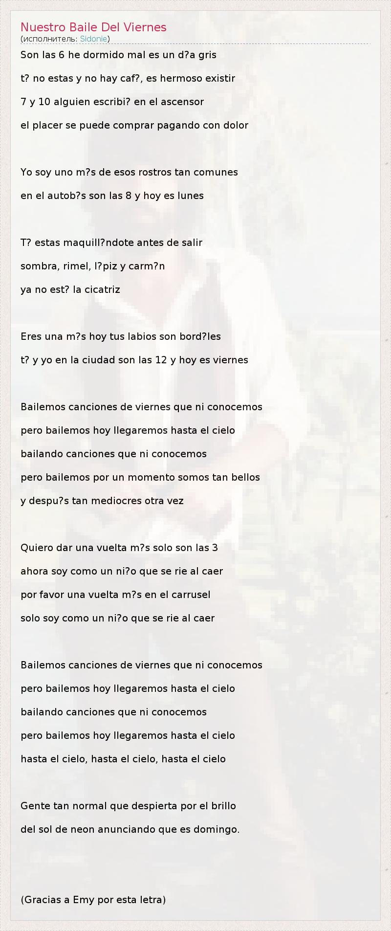 Son las 6 he dormido mal es un d?a gris t? no estas y no hay caf?, es hermoso existir 7 y 10 alguien escribi? en el ascensor el placer se puede comprar pagando con dolor Yo soy uno m?s de esos rostros tan comunes en el autob?s son las 8 y hoy es lunes T? estas maquill?ndote antes de salir sombra, rimel, l?piz y carm?n ya no est? la cicatriz Eres una m?s hoy tus labios son bord?les t? y yo en la ciudad son las 12 y hoy es viernes Bailemos canciones de viernes que ni conocemos pero bailemos hoy llegaremos hasta el cielo bailando canciones que ni conocemos pero bailemos por un momento somos tan bellos y despu?s tan mediocres otra vez Quiero dar una vuelta m?s solo son las 3 ahora soy como un ni?o que se rie al caer por favor una vuelta m?s en el carrusel solo soy como un ni?o que se rie al caer Bailemos canciones de viernes que ni conocemos pero bailemos hoy llegaremos hasta el cielo bailando canciones que ni conocemos pero bailemos hoy llegaremos hasta el cielo hasta el cielo, hasta el cielo, hasta el cielo Gente tan normal que despierta por el brillo del sol de neon anunciando que es domingo. (Gracias a Emy por esta letra)