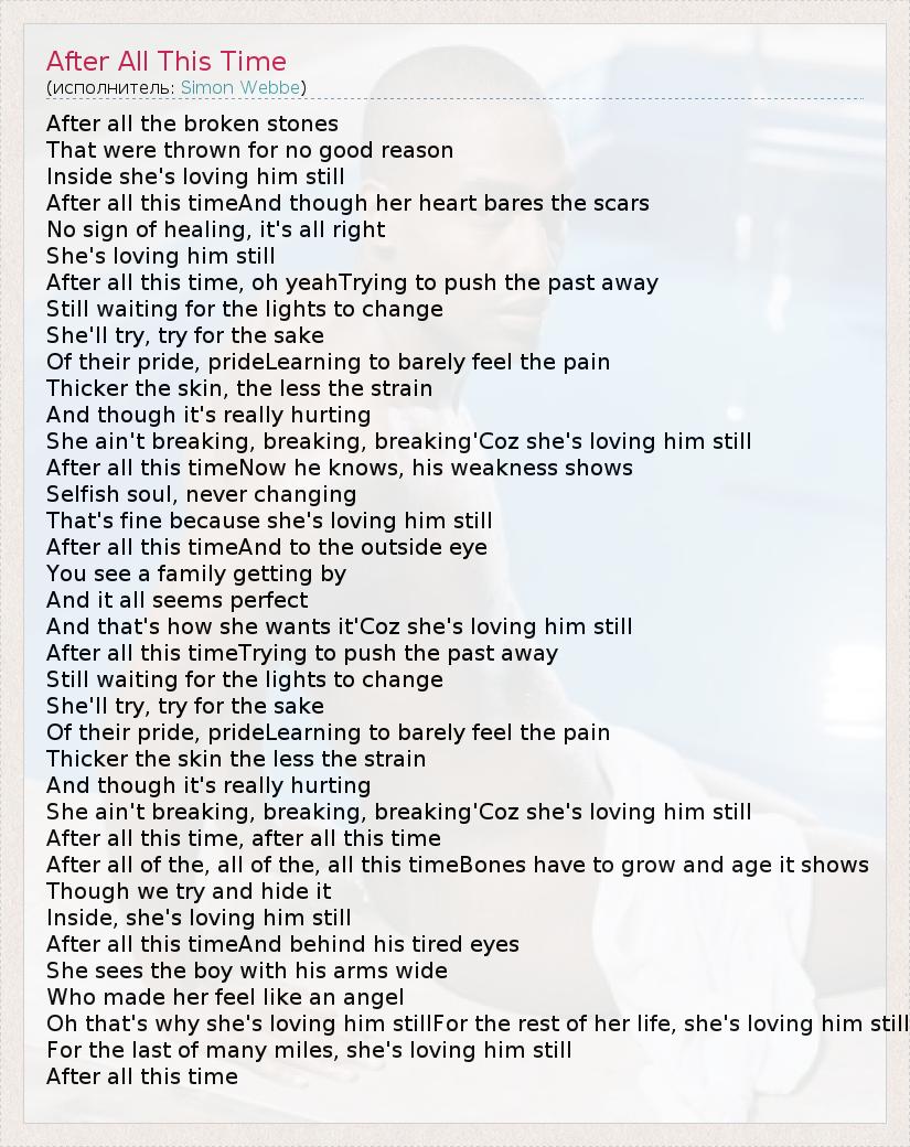 After all the broken stones That were thrown for no good reason Inside she's loving him still After all this timeAnd though her heart bares the scars No sign of healing, it's all right She's loving him still After all this time, oh yeahTrying to push the past away Still waiting for the lights to change She'll try, try for the sake Of their pride, prideLearning to barely feel the pain Thicker the skin, the less the strain And though it's really hurting She ain't breaking, breaking, breaking'Coz she's loving him still After all this timeNow he knows, his weakness shows Selfish soul, never changing That's fine because she's loving him still After all this timeAnd to the outside eye You see a family getting by And it all seems perfect And that's how she wants it'Coz she's loving him still After all this timeTrying to push the past away Still waiting for the lights to change She'll try, try for the sake Of their pride, prideLearning to barely feel the pain Thicker the skin the less the strain And though it's really hurting She ain't breaking, breaking, breaking'Coz she's loving him still After all this time, after all this time After all of the, all of the, all this timeBones have to grow and age it shows Though we try and hide it Inside, she's loving him still After all this timeAnd behind his tired eyes She sees the boy with his arms wide Who made her feel like an angel Oh that's why she's loving him stillFor the rest of her life, she's loving him still For the last of many miles, she's loving him still After all this time