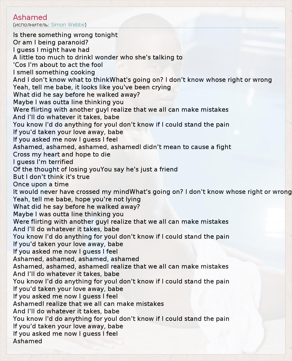 Is there something wrong tonight Or am I being paranoid? I guess I might have had A little too much to drinkI wonder who she's talking to 'Cos I'm about to act the fool I smell something cooking And I don't know what to thinkWhat's going on? I don't know whose right or wrong Yeah, tell me babe, it looks like you've been crying What did he say before he walked away? Maybe I was outta line thinking you Were flirting with another guyI realize that we all can make mistakes And I'll do whatever it takes, babe You know I'd do anything for youI don't know if I could stand the pain If you'd taken your love away, babe If you asked me now I guess I feel Ashamed, ashamed, ashamed, ashamedI didn't mean to cause a fight Cross my heart and hope to die I guess I'm terrified Of the thought of losing youYou say he's just a friend But I don't think it's true Once upon a time It would never have crossed my mindWhat's going on? I don't know whose right or wrong Yeah, tell me babe, hope you're not lying What did he say before he walked away? Maybe I was outta line thinking you Were flirting with another guyI realize that we all can make mistakes And I'll do whatever it takes, babe You know I'd do anything for youI don't know if I could stand the pain If you'd taken your love away, babe If you asked me now I guess I feel Ashamed, ashamed, ashamed, ashamed Ashamed, ashamed, ashamedI realize that we all can make mistakes And I'll do whatever it takes, babe You know I'd do anything for youI don't know if I could stand the pain If you'd taken your love away, babe If you asked me now I guess I feel AshamedI realize that we all can make mistakes And I'll do whatever it takes, babe You know I'd do anything for youI don't know if I could stand the pain If you'd taken your love away, babe If you asked me now I guess I feel Ashamed