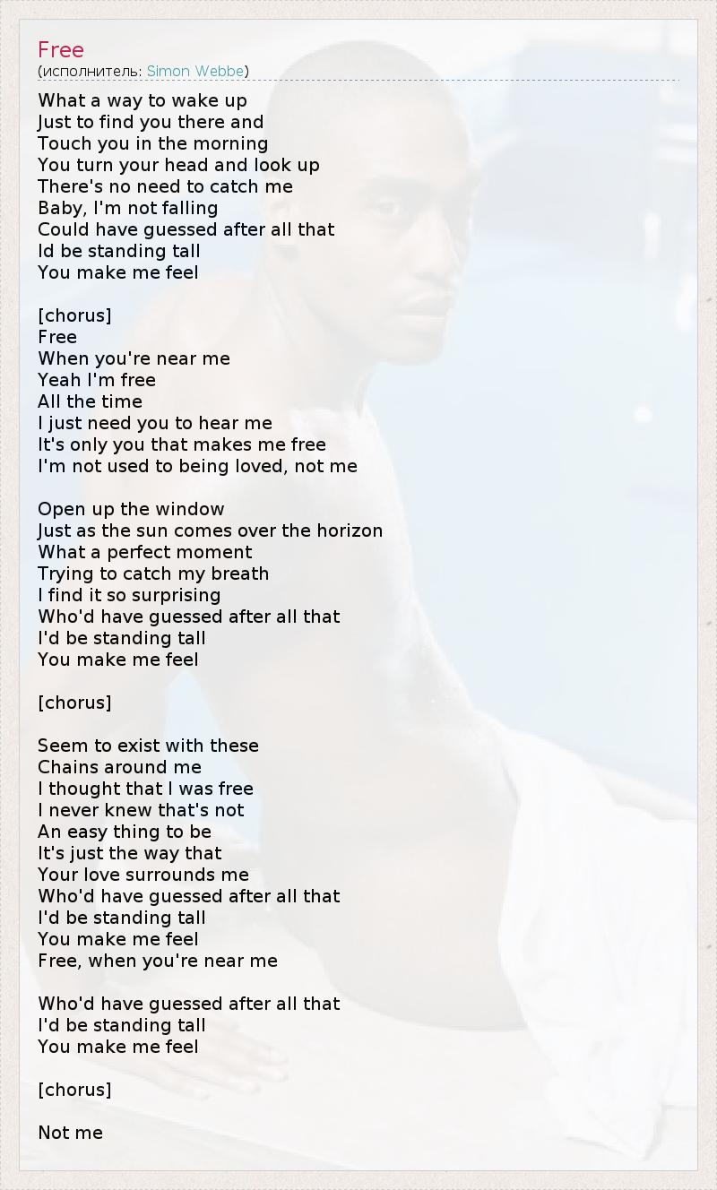 What a way to wake up Just to find you there and Touch you in the morning You turn your head and look up There's no need to catch me Baby, I'm not falling Could have guessed after all that Id be standing tall You make me feel [chorus] Free When you're near me Yeah I'm free All the time I just need you to hear me It's only you that makes me free I'm not used to being loved, not me Open up the window Just as the sun comes over the horizon What a perfect moment Trying to catch my breath I find it so surprising Who'd have guessed after all that I'd be standing tall You make me feel [chorus] Seem to exist with these Chains around me I thought that I was free I never knew that's not An easy thing to be It's just the way that Your love surrounds me Who'd have guessed after all that I'd be standing tall You make me feel Free, when you're near me Who'd have guessed after all that I'd be standing tall You make me feel [chorus] Not me