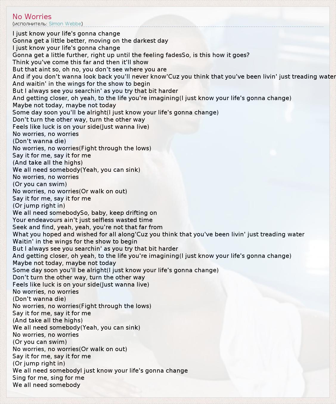 I just know your life's gonna change Gonna get a little better, moving on the darkest day I just know your life's gonna change Gonna get a little further, right up until the feeling fadesSo, is this how it goes? Think you've come this far and then it'll show But that aint so, oh no, you don't see where you are And if you don't wanna look back you'll never know'Cuz you think that you've been livin' just treading water And waitin' in the wings for the show to begin But I always see you searchin' as you try that bit harder And getting closer, oh yeah, to the life you're imagining(I just know your life's gonna change) Maybe not today, maybe not today Some day soon you'll be alright(I just know your life's gonna change) Don't turn the other way, turn the other way Feels like luck is on your side(Just wanna live) No worries, no worries (Don't wanna die) No worries, no worries(Fight through the lows) Say it for me, say it for me (And take all the highs) We all need somebody(Yeah, you can sink) No worries, no worries (Or you can swim) No worries, no worries(Or walk on out) Say it for me, say it for me (Or jump right in) We all need somebodySo, baby, keep drifting on Your endeavours ain't just selfless wasted time Seek and find, yeah, yeah, you're not that far from What you hoped and wished for all along'Cuz you think that you've been livin' just treading water Waitin' in the wings for the show to begin But I always see you searchin' as you try that bit harder And getting closer, oh yeah, to the life you're imagining(I just know your life's gonna change) Maybe not today, maybe not today Some day soon you'll be alright(I just know your life's gonna change) Don't turn the other way, turn the other way Feels like luck is on your side(Just wanna live) No worries, no worries (Don't wanna die) No worries, no worries(Fight through the lows) Say it for me, say it for me (And take all the highs) We all need somebody(Yeah, you can sink) No worries, no worries (Or you can swim) No worries, no worries(Or walk on out) Say it for me, say it for me (Or jump right in) We all need somebodyI just know your life's gonna change Sing for me, sing for me We all need somebody