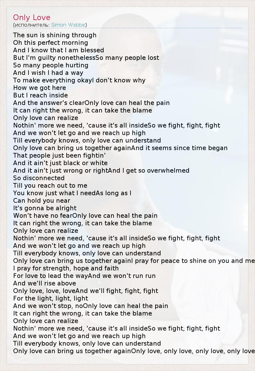 The sun is shining through Oh this perfect morning And I know that I am blessed But I'm guilty nonethelessSo many people lost So many people hurting And I wish I had a way To make everything okayI don't know why How we got here But I reach inside And the answer's clearOnly love can heal the pain It can right the wrong, it can take the blame Only love can realize Nothin' more we need, 'cause it's all insideSo we fight, fight, fight And we won't let go and we reach up high Till everybody knows, only love can understand Only love can bring us together againAnd it seems since time began That people just been fightin' And it ain't just black or white And it ain't just wrong or rightAnd I get so overwhelmed So disconnected Till you reach out to me You know just what I needAs long as I Can hold you near It's gonna be alright Won't have no fearOnly love can heal the pain It can right the wrong, it can take the blame Only love can realize Nothin' more we need, 'cause it's all insideSo we fight, fight, fight And we won't let go and we reach up high Till everybody knows, only love can understand Only love can bring us together againI pray for peace to shine on you and me I pray for strength, hope and faith For love to lead the wayAnd we won't run run And we'll rise above Only love, love, loveAnd we'll fight, fight, fight For the light, light, light And we won't stop, noOnly love can heal the pain It can right the wrong, it can take the blame Only love can realize Nothin' more we need, 'cause it's all insideSo we fight, fight, fight And we won't let go and we reach up high Till everybody knows, only love can understand Only love can bring us together againOnly love, only love, only love, only love