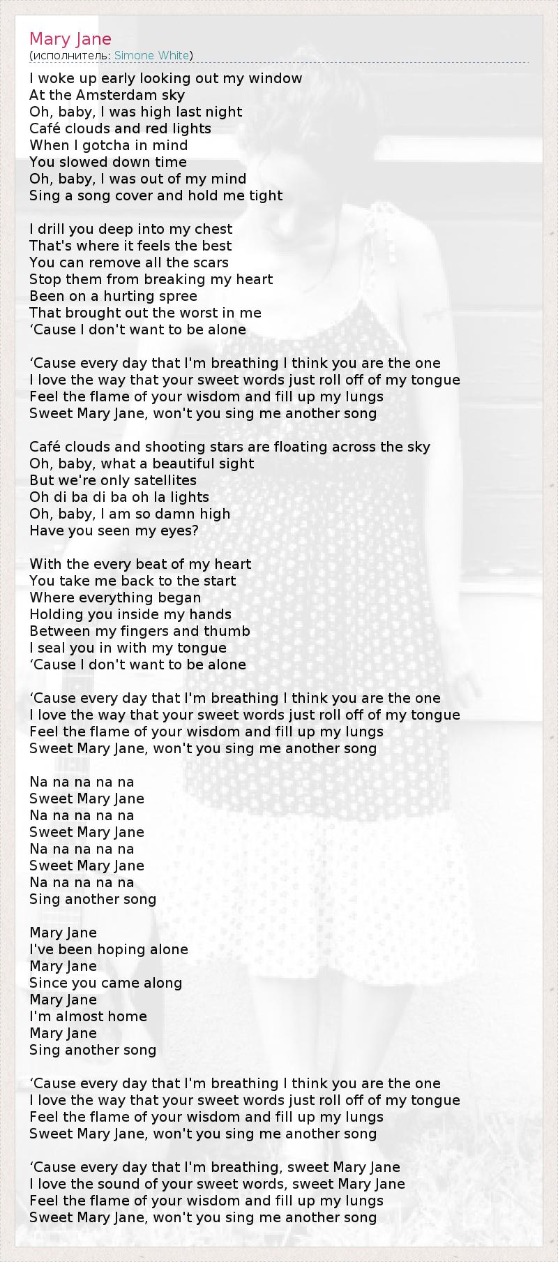 Я проснулся рано и смотрел из своего окна На небо Амстердама. О, милая, прошлая ночь была восторгом: Кофейные облака и алые огни. С тех пор как я постиг твою суть, Время замедлило ход. О, милая, я лишился рассудка, Спой песню, укутай меня и держи крепче. Я спрячу тебя глубоко в груди, Это дарит лучшие чувства. Ты можешь исцелить все шрамы, Унять их, пока они не разбили мне сердце. Я забывался в ранящем душу кутеже, Который обнажил мои худшие черты. Виной всему страх одиночества. И каждый день, который я дышу, я убеждаюсь в том, что ты моё единственное утешение. Мне нравится, как твои сладкие слова срываются с моих губ. Я чувствую жар твоей философии и заполняю свои лёгкие. Милая Мэри Джейн, спой мне ещё одну песню. Кофейные облака и падающие звёзды проплывают по небу. О, милая, какой прекрасный вид! Но мы всего лишь спутники светил. О, ди-ба-ди-ба, о-ла-огни! О, милая, я в таком экстазе! Ты видела мои глаза? С каждым ударом моего сердца Ты возвращаешь меня всё ближе к истоку, Туда, откуда всё началось. Я держу тебя в своих руках, Между кончиками пальцев, Я скреплю тебя языком как печатью. Ведь я бегу от одиночества. И каждый день, который я дышу, я убеждаюсь в том, что ты моё единственное утешение. Мне нравится, как твои сладкие слова срываются с моих губ. Я чувствую жар твоей философии и заполняю свои лёгкие. Милая Мэри Джейн, спой мне ещё одну песню. На-на-на-на-на, Милая Мэри Джейн, На-на-на-на-на, Милая Мэри Джейн, На-на-на-на-на, Милая Мэри Джейн, На-на-на-на-на, Спой ещё одну песню. Мэри Джейн, Я одиноко лелеял надежду, Мэри Джейн, С тех пор как узнал тебя. Мэри Джейн, Я почти дома, Мэри Джейн, Спой ещё одну песню. Каждый день, который я дышу, я убеждаюсь в том, что ты моё единственное утешение. Мне нравится, как твои сладкие слова срываются с моих губ. Я чувствую жар твоей философии и заполняю свои лёгкие. Милая Мэри Джейн, спой мне ещё одну песню. Каждый день, который я дышу, милая Мэри Джейн... Мне нравится звук твоих сладких слов, милая Мэри Джейн... Я чувствую жар твоей философии и заполняю свои лёгкие. Милая Мэри Джейн, спой мне ещё одну песню. * - Мэри Джейн – сленговое название марихуаны.