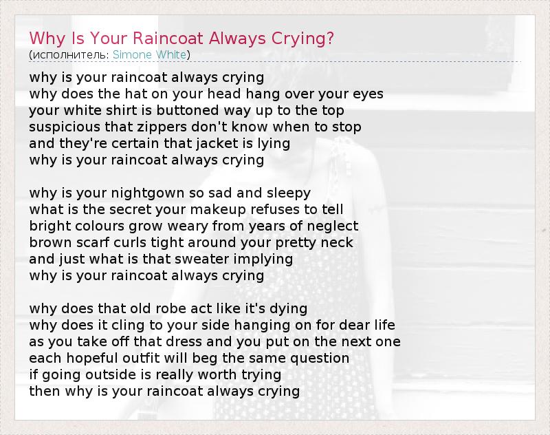 why is your raincoat always crying why does the hat on your head hang over your eyes your white shirt is buttoned way up to the top suspicious that zippers don't know when to stop and they're certain that jacket is lying why is your raincoat always crying why is your nightgown so sad and sleepy what is the secret your makeup refuses to tell bright colours grow weary from years of neglect brown scarf curls tight around your pretty neck and just what is that sweater implying why is your raincoat always crying why does that old robe act like it's dying why does it cling to your side hanging on for dear life as you take off that dress and you put on the next one each hopeful outfit will beg the same question if going outside is really worth trying then why is your raincoat always crying