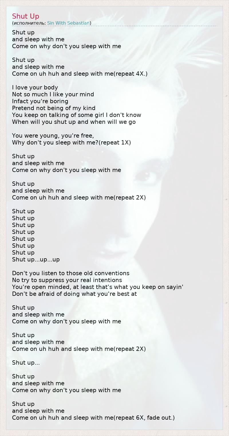 Shut up and sleep with me Come on why don't you sleep with me Shut up and sleep with me Come on uh huh and sleep with me(repeat 4X.) I love your body Not so much I like your mind Infact you're boring Pretend not being of my kind You keep on talking of some girl I don't know When will you shut up and when will we go You were young, you're free, Why don't you sleep with me?(repeat 1X) Shut up and sleep with me Come on why don't you sleep with me Shut up and sleep with me Come on uh huh and sleep with me(repeat 2X) Shut up Shut up Shut up Shut up Shut up Shut up Shut up Shut up...up...up Don't you listen to those old conventions No try to suppress your real intentions You're open minded, at least that's what you keep on sayin' Don't be afraid of doing what you're best at Shut up and sleep with me Come on why don't you sleep with me Shut up and sleep with me Come on uh huh and sleep with me(repeat 2X) Shut up... Shut up and sleep with me Come on why don't you sleep with me Shut up and sleep with me Come on uh huh and sleep with me(repeat 6X, fade out.)