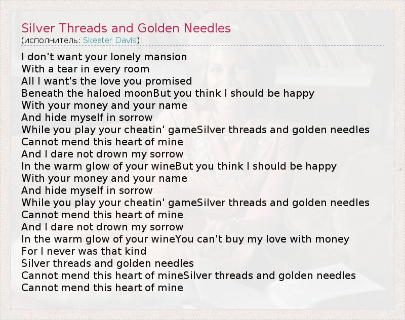 А как ты думаешь, о чем песня "Silver Threads and Golden Needles" ?