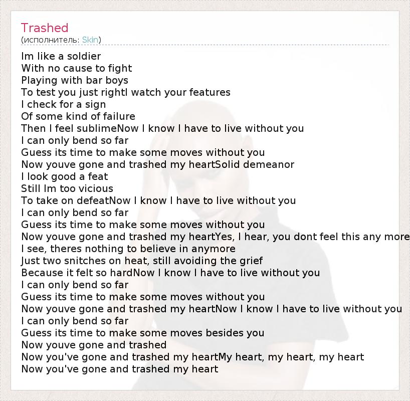 Now youve gone and trashed my heartYes, I hear, you dont feel this any more