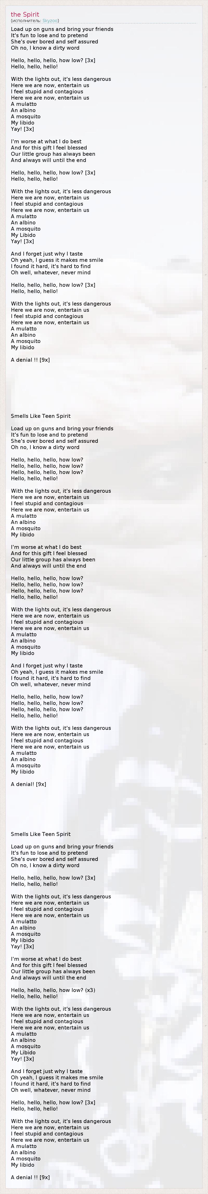 Load up on guns and bring your friends It's fun to lose and to pretend She's over bored and self assured Oh no, I know a dirty word Hello, hello, hello, how low? [3x] Hello, hello, hello! With the lights out, it's less dangerous Here we are now, entertain us I feel stupid and contagious Here we are now, entertain us A mulatto An albino A mosquito My libido Yay! [3x] I'm worse at what I do best And for this gift I feel blessed Our little group has always been And always will until the end Hello, hello, hello, how low? [3x] Hello, hello, hello! With the lights out, it's less dangerous Here we are now, entertain us I feel stupid and contagious Here we are now, entertain us A mulatto An albino A mosquito My Libido Yay! [3x] And I forget just why I taste Oh yeah, I guess it makes me smile I found it hard, it's hard to find Oh well, whatever, never mind Hello, hello, hello, how low? [3x] Hello, hello, hello! With the lights out, it's less dangerous Here we are now, entertain us I feel stupid and contagious Here we are now, entertain us A mulatto An albino A mosquito My libido A denial !! [9x] Smells Like Teen Spirit Load up on guns and bring your friends It's fun to lose and to pretend She's over bored and self assured Oh no, I know a dirty word Hello, hello, hello, how low? Hello, hello, hello, how low? Hello, hello, hello, how low? Hello, hello, hello! With the lights out, it's less dangerous Here we are now, entertain us I feel stupid and contagious Here we are now, entertain us A mulatto An albino A mosquito My libido I'm worse at what I do best And for this gift I feel blessed Our little group has always been And always will until the end Hello, hello, hello, how low? Hello, hello, hello, how low? Hello, hello, hello, how low? Hello, hello, hello! With the lights out, it's less dangerous Here we are now, entertain us I feel stupid and contagious Here we are now, entertain us A mulatto An albino A mosquito My libido And I forget just why I taste Oh yeah, I guess it makes me smile I found it hard, it's hard to find Oh well, whatever, never mind Hello, hello, hello, how low? Hello, hello, hello, how low? Hello, hello, hello, how low? Hello, hello, hello! With the lights out, it's less dangerous Here we are now, entertain us I feel stupid and contagious Here we are now, entertain us A mulatto An albino A mosquito My libido A denial! [9x] Smells Like Teen Spirit Load up on guns and bring your friends It's fun to lose and to pretend She's over bored and self assured Oh no, I know a dirty word Hello, hello, hello, how low? [3x] Hello, hello, hello! With the lights out, it's less dangerous Here we are now, entertain us I feel stupid and contagious Here we are now, entertain us A mulatto An albino A mosquito My libido Yay! [3x] I'm worse at what I do best And for this gift I feel blessed Our little group has always been And always will until the end Hello, hello, hello, how low? (x3) Hello, hello, hello! With the lights out, it's less dangerous Here we are now, entertain us I feel stupid and contagious Here we are now, entertain us A mulatto An albino A mosquito My Libido Yay! [3x] And I forget just why I taste Oh yeah, I guess it makes me smile I found it hard, it's hard to find Oh well, whatever, never mind Hello, hello, hello, how low? [3x] Hello, hello, hello! With the lights out, it's less dangerous Here we are now, entertain us I feel stupid and contagious Here we are now, entertain us A mulatto An albino A mosquito My libido A denial !! [9x]