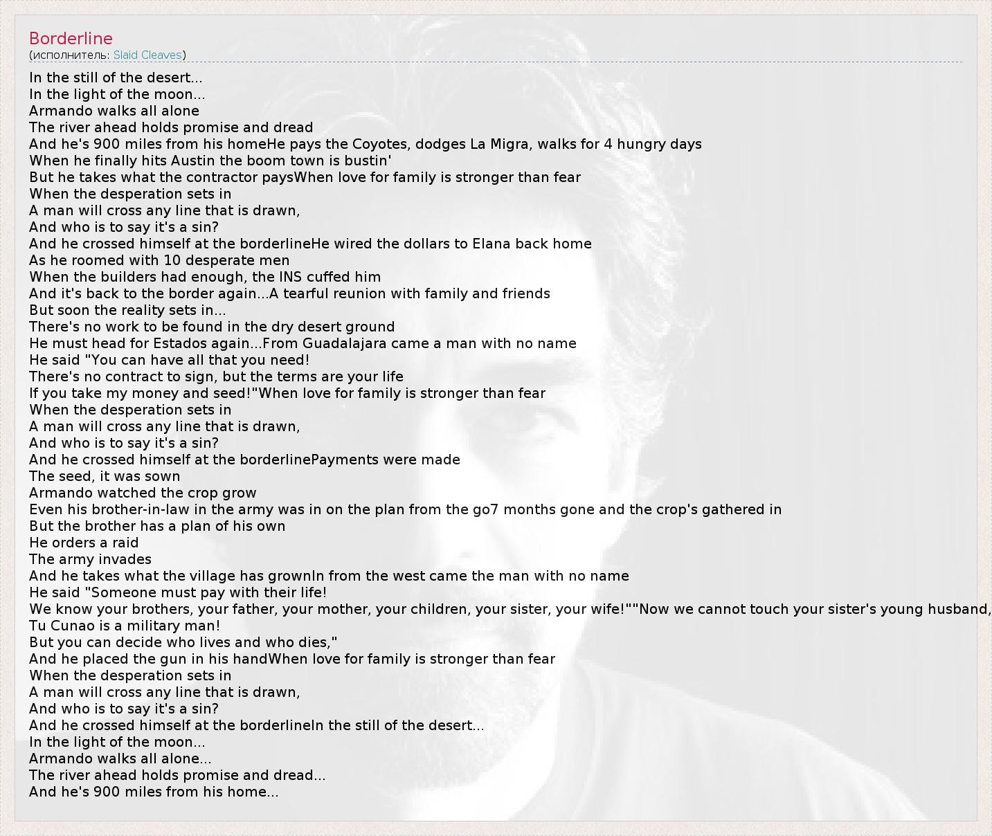 In the still of the desert... In the light of the moon... Armando walks all alone The river ahead holds promise and dread And he's 900 miles from his homeHe pays the Coyotes, dodges La Migra, walks for 4 hungry days When he finally hits Austin the boom town is bustin' But he takes what the contractor paysWhen love for family is stronger than fear When the desperation sets in A man will cross any line that is drawn, And who is to say it's a sin? And he crossed himself at the borderlineHe wired the dollars to Elana back home As he roomed with 10 desperate men When the builders had enough, the INS cuffed him And it's back to the border again...A tearful reunion with family and friends But soon the reality sets in... There's no work to be found in the dry desert ground He must head for Estados again...From Guadalajara came a man with no name He said "You can have all that you need! There's no contract to sign, but the terms are your life If you take my money and seed!"When love for family is stronger than fear When the desperation sets in A man will cross any line that is drawn, And who is to say it's a sin? And he crossed himself at the borderlinePayments were made The seed, it was sown Armando watched the crop grow Even his brother-in-law in the army was in on the plan from the go7 months gone and the crop's gathered in But the brother has a plan of his own He orders a raid The army invades And he takes what the village has grownIn from the west came the man with no name He said "Someone must pay with their life! We know your brothers, your father, your mother, your children, your sister, your wife!""Now we cannot touch your sister's young husband, Tu Cunao is a military man! But you can decide who lives and who dies," And he placed the gun in his handWhen love for family is stronger than fear When the desperation sets in A man will cross any line that is drawn, And who is to say it's a sin? And he crossed himself at the borderlineIn the still of the desert... In the light of the moon... Armando walks all alone... The river ahead holds promise and dread... And he's 900 miles from his home...