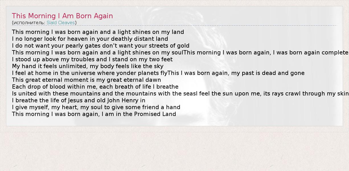 This morning I was born again and a light shines on my land I no longer look for heaven in your deathly distant land I do not want your pearly gates don't want your streets of gold This morning I was born again and a light shines on my soulThis morning I was born again, I was born again complete I stood up above my troubles and I stand on my two feet My hand it feels unlimited, my body feels like the sky I feel at home in the universe where yonder planets flyThis I was born again, my past is dead and gone This great eternal moment is my great eternal dawn Each drop of blood within me, each breath of life I breathe Is united with these mountains and the mountains with the seasI feel the sun upon me, its rays crawl through my skin I breathe the life of Jesus and old John Henry in I give myself, my heart, my soul to give some friend a hand This morning I was born again, I am in the Promised Land