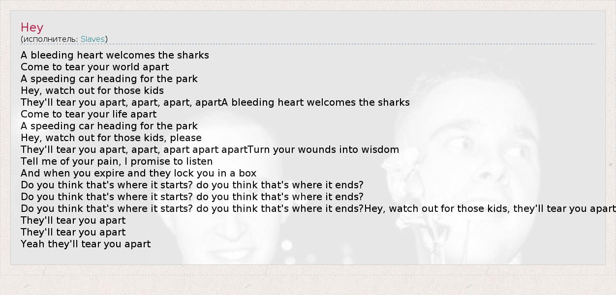 Do you think that's where it starts? do you think that's where it ends?Hey, watch out for those kids, they'll tear you apart