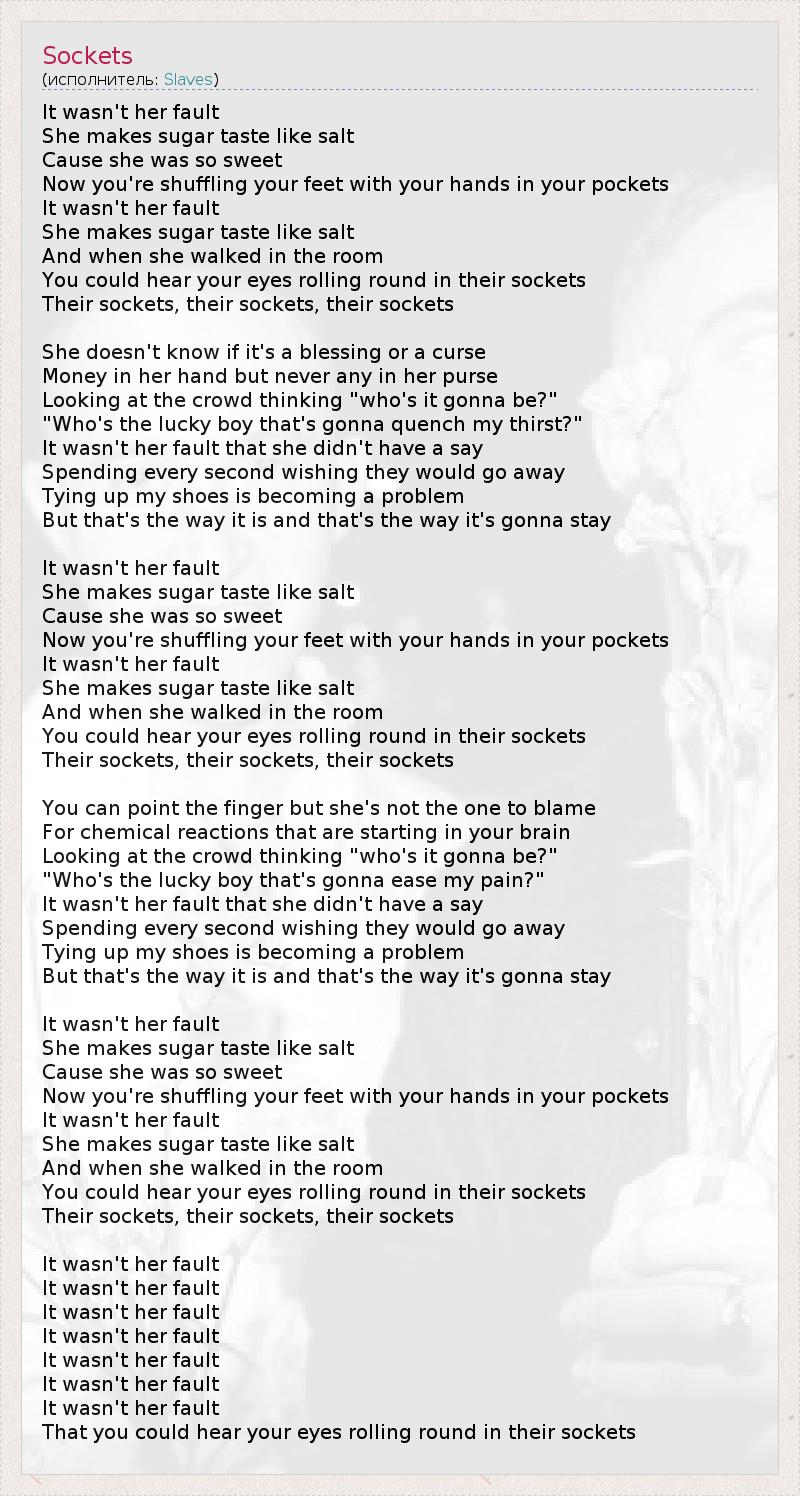It wasn't her fault She makes sugar taste like salt Cause she was so sweet Now you're shuffling your feet with your hands in your pockets It wasn't her fault She makes sugar taste like salt And when she walked in the room You could hear your eyes rolling round in their sockets Their sockets, their sockets, their sockets She doesn't know if it's a blessing or a curse Money in her hand but never any in her purse Looking at the crowd thinking "who's it gonna be?" "Who's the lucky boy that's gonna quench my thirst?" It wasn't her fault that she didn't have a say Spending every second wishing they would go away Tying up my shoes is becoming a problem But that's the way it is and that's the way it's gonna stay It wasn't her fault She makes sugar taste like salt Cause she was so sweet Now you're shuffling your feet with your hands in your pockets It wasn't her fault She makes sugar taste like salt And when she walked in the room You could hear your eyes rolling round in their sockets Their sockets, their sockets, their sockets You can point the finger but she's not the one to blame For chemical reactions that are starting in your brain Looking at the crowd thinking "who's it gonna be?" "Who's the lucky boy that's gonna ease my pain?" It wasn't her fault that she didn't have a say Spending every second wishing they would go away Tying up my shoes is becoming a problem But that's the way it is and that's the way it's gonna stay It wasn't her fault She makes sugar taste like salt Cause she was so sweet Now you're shuffling your feet with your hands in your pockets It wasn't her fault She makes sugar taste like salt And when she walked in the room You could hear your eyes rolling round in their sockets Their sockets, their sockets, their sockets It wasn't her fault It wasn't her fault It wasn't her fault It wasn't her fault It wasn't her fault It wasn't her fault It wasn't her fault That you could hear your eyes rolling round in their sockets