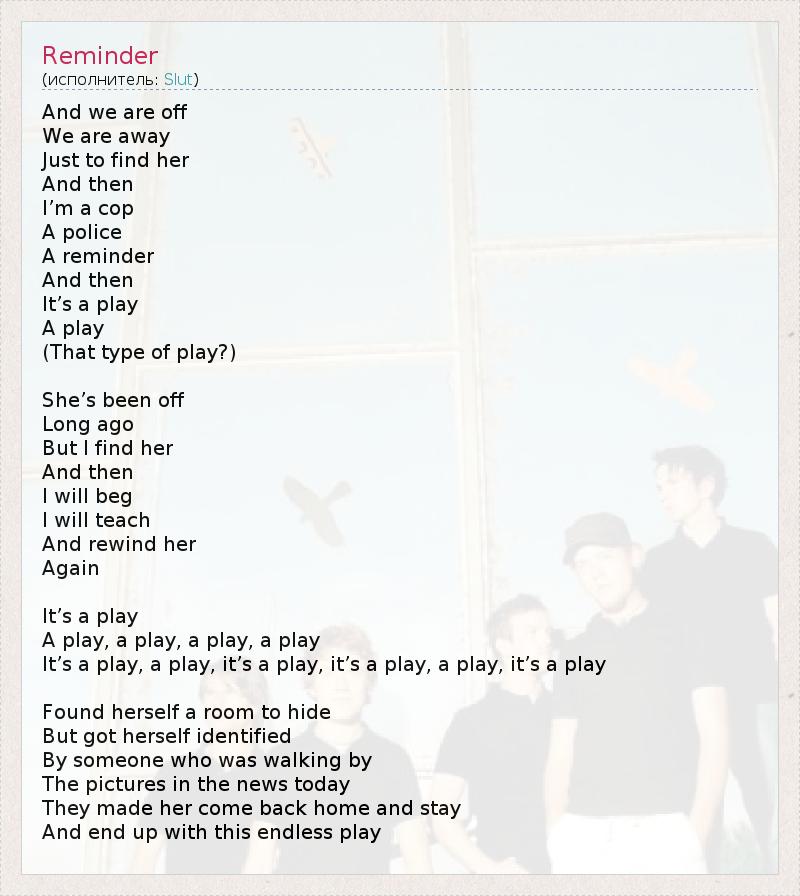 And we are off We are away Just to find her And then I’m a cop A police A reminder And then It’s a play A play (That type of play?) She’s been off Long ago But I find her And then I will beg I will teach And rewind her Again It’s a play A play, a play, a play, a play It’s a play, a play, it’s a play, it’s a play, a play, it’s a play Found herself a room to hide But got herself identified By someone who was walking by The pictures in the news today They made her come back home and stay And end up with this endless play