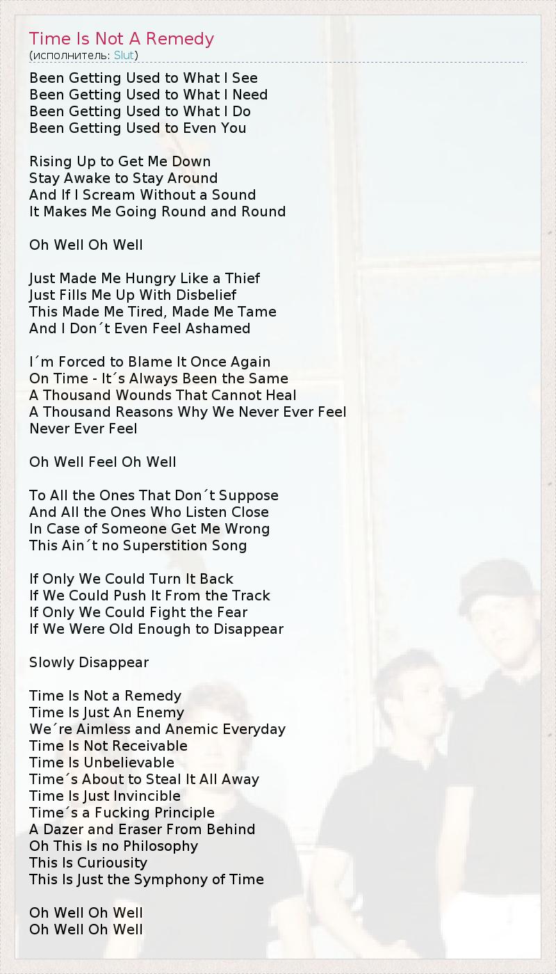 Привыкала к тому, что я вижу Привыкала к тому, что мне нужно Привыкала к тому, что я делаю Привыкала к даже вы Rising Up Получить Me Down Бодрствовать , чтобы Stay Around И если я Крик без звука Это заставляет меня ходить вокруг да около Ну, что ж Oh Well Просто заставил меня Hungry , как вор Просто Заполняет Me Up с недоверием Это заставило меня Устали , заставил меня Приручение И я не Даже стыдно I'm Вынужденный Blame It Once Again On Time - Вы можете сделать всегда было то же Тысяча раны, которые не могут излечить Тысяча причин, почему мы никогда не Feel Никогда не Почувствуйте Ну, что ж Feel Oh Well Для всех тех, которые Подобные игры Предположим И все те, кто Слушайте Закрыть В случае Someone поймите меня неправильно Это Ain't нет Суеверие Песня Если бы мы только могли включить его обратно Если бы мы могли Push It От Track Если бы мы только могли преодолевать страх Если мы были старыми Достаточно Исчезают Медленно исчезают Время неустранения Time Is JustВраг We're Бесцельное и Анемический Каждый день Время не задолженность Время невероятно Time's О украсть It All Away Time Is Just Непобедимый Time's гребаный Принципа Dazer и Ластик сзади О Это не философия This Is Curiousity Это простоСимфония Времени Ну, что ж Oh Well Ну, что ж Oh Well
