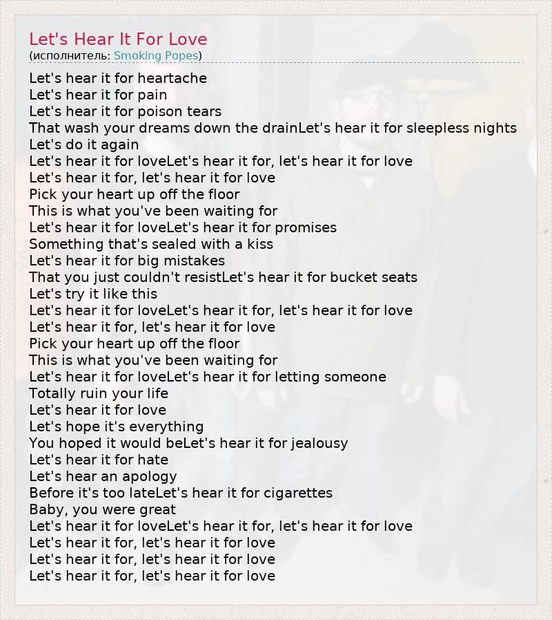Let's hear it for heartache Let's hear it for pain Let's hear it for poison tears That wash your dreams down the drainLet's hear it for sleepless nights Let's do it again Let's hear it for loveLet's hear it for, let's hear it for love Let's hear it for, let's hear it for love Pick your heart up off the floor This is what you've been waiting for Let's hear it for loveLet's hear it for promises Something that's sealed with a kiss Let's hear it for big mistakes That you just couldn't resistLet's hear it for bucket seats Let's try it like this Let's hear it for loveLet's hear it for, let's hear it for love Let's hear it for, let's hear it for love Pick your heart up off the floor This is what you've been waiting for Let's hear it for loveLet's hear it for letting someone Totally ruin your life Let's hear it for love Let's hope it's everything You hoped it would beLet's hear it for jealousy Let's hear it for hate Let's hear an apology Before it's too lateLet's hear it for cigarettes Baby, you were great Let's hear it for loveLet's hear it for, let's hear it for love Let's hear it for, let's hear it for love Let's hear it for, let's hear it for love Let's hear it for, let's hear it for love