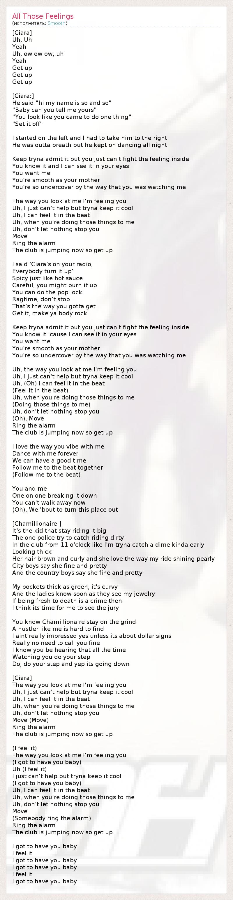 [Ciara] А, а, Да! А, а-а, а, Да! Веселей! Веселей! Веселей! [Ciara:] Он сказал: «Привет! Меня зовут так-то и так-то. А тебя, детка, как зовут? По-моему, ты пришла сюда с определённой целью. Покажи, на что ты способна». Мы начали на одном танцполе, продолжили на другом. Даже запыхавшись, он танцевал всю ночь. Постарайся признаться себе в том, что не можешь побороть это чувство, Ты сам знаешь это, и это видно по твоим глазам: Ты хочешь меня. Ты удивительный, весь в маму, И у тебя такой загадочный взгляд! Ты на меня смотришь и я «чувствую» тебя, С трудом сохраняя самообладание. Я чувствую это и в ритме, Когда ты проделываешь со мной все эти вещи. Я молюсь о том, чтобы ничто тебе не помешало – Двигайся, Бей тревогу. Весь клуб вскочил на ноги, так веселей! Я говорю: «Песня Ciara звучит по радио, Эй, сделайте погромче!» Эта музыка будет поострее чили, Осторожно, а то обожжёшься! Это вам не попса, Это регтайм, не останавливайся! Именно так, Только в этом случае ты будешь зажигать по-настоящему! Постарайся признаться себе в том, что не можешь побороть это чувство, Ты сам знаешь это, и это видно по твоим глазам: Ты хочешь меня. Ты удивительный, весь в маму, И у тебя такой загадочный взгляд! Ты на меня смотришь и я «чувствую» тебя, С трудом сохраняя самообладание. Я чувствую это и в ритме, (чувствую это и в ритме). Когда ты проделываешь со мной все эти вещи (проделываешь со мной все эти вещи). Я молюсь о том, чтобы ничто тебе не помешало – Двигайся, Бей тревогу. Весь клуб вскочил на ноги, так веселей! Мне нравится, как ты двигаешься со мной, Танцуй со мной вечно. Мы можем хорошо провести время. Веди меня в ритм (веди меня в ритм). Ты и я, Мы вместе будем терять самообладание, Теперь тебе не уйти. Сейчас мы заставим народ веселиться! [Chamillionaire:] А теперь очередь парня, который любит ездить с шиком, Тот самый, которого копы хотели взять с поличным. В клубе я с 11 часов, чтобы пораньше снять тёлку покруче. Выглядит потрясно – У неё каштановые кучерявые волосы, и ей нравится, как блестит моя тачка. Парни из города говорят, что она оч. симпатичная, И парни из пригорода поддерживают их на все сто. Мои карманы набиты зелёными, это трудно скрыть. Девчонки это понимают, увидев мои украшения. Если дерзость (клёвый стиль) – это преступление, То мне уже давно пора предстать перед судом присяжных. Знайте, Chamillionaire по-прежнему в деле. Такого дельца ещё поискать! Меня трудно удивить, если речь идёт не о купюрах. Мне не нужно называть тебя красоткой. Уверен, ты это и так постоянно слышишь, Особенно, когда ты танцуешь, Танцуешь… Вот, собственно, всё. [Ciara] Ты на меня смотришь и я «чувствую» тебя, С трудом сохраняя самообладание. Я чувствую это и в ритме, Когда ты проделываешь со мной все эти вещи. Я молюсь о том, чтобы ничто тебе не помешало – Двигайся (двигайся), Бей тревогу. Весь клуб вскочил на ноги, так веселей! (я чувствую это) Ты на меня смотришь и я «чувствую» тебя, (ты нужен мне, малыш). (я чувствую это). Я с трудом сохраняю самообладание. (ты нужен мне, малыш). Я чувствую это и в ритме, Когда ты проделываешь со мной все эти вещи Я молюсь о том, чтобы ничто тебе не помешало – Двигайся, (кто-нибудь, забейте тревогу!) Бей тревогу. Весь клуб вскочил на ноги, так веселей! Ты мне нужен, малыш. Я чувствую это. Ты мне нужен, малыш. Ты мне нужен, малыш. Я чувствую это. Ты мне нужен, малыш.