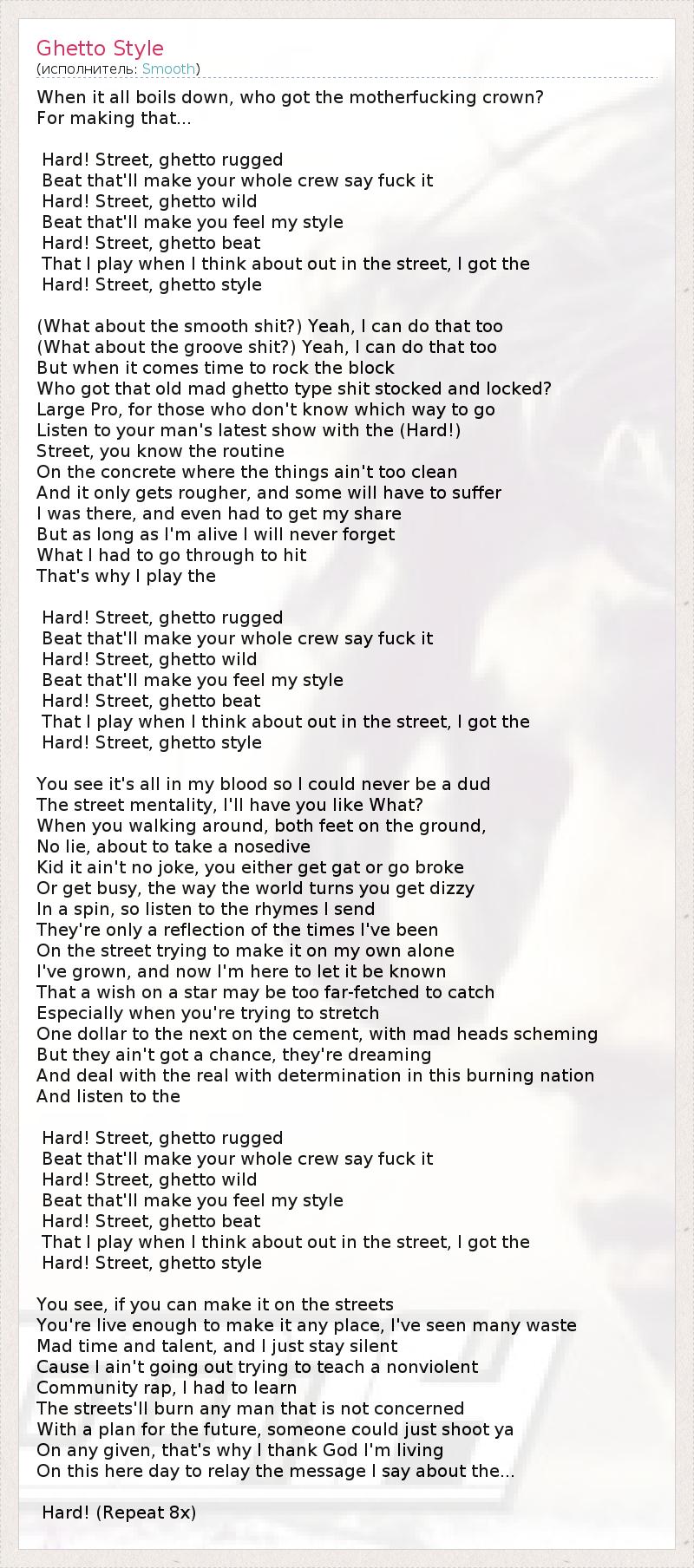When it all boils down, who got the motherfucking crown? For making that... Hard! Street, ghetto rugged Beat that'll make your whole crew say fuck it Hard! Street, ghetto wild Beat that'll make you feel my style Hard! Street, ghetto beat That I play when I think about out in the street, I got the Hard! Street, ghetto style (What about the smooth shit?) Yeah, I can do that too (What about the groove shit?) Yeah, I can do that too But when it comes time to rock the block Who got that old mad ghetto type shit stocked and locked? Large Pro, for those who don't know which way to go Listen to your man's latest show with the (Hard!) Street, you know the routine On the concrete where the things ain't too clean And it only gets rougher, and some will have to suffer I was there, and even had to get my share But as long as I'm alive I will never forget What I had to go through to hit That's why I play the Hard! Street, ghetto rugged Beat that'll make your whole crew say fuck it Hard! Street, ghetto wild Beat that'll make you feel my style Hard! Street, ghetto beat That I play when I think about out in the street, I got the Hard! Street, ghetto style You see it's all in my blood so I could never be a dud The street mentality, I'll have you like What? When you walking around, both feet on the ground, No lie, about to take a nosedive Kid it ain't no joke, you either get gat or go broke Or get busy, the way the world turns you get dizzy In a spin, so listen to the rhymes I send They're only a reflection of the times I've been On the street trying to make it on my own alone I've grown, and now I'm here to let it be known That a wish on a star may be too far-fetched to catch Especially when you're trying to stretch One dollar to the next on the cement, with mad heads scheming But they ain't got a chance, they're dreaming And deal with the real with determination in this burning nation And listen to the Hard! Street, ghetto rugged Beat that'll make your whole crew say fuck it Hard! Street, ghetto wild Beat that'll make you feel my style Hard! Street, ghetto beat That I play when I think about out in the street, I got the Hard! Street, ghetto style You see, if you can make it on the streets You're live enough to make it any place, I've seen many waste Mad time and talent, and I just stay silent Cause I ain't going out trying to teach a nonviolent Community rap, I had to learn The streets'll burn any man that is not concerned With a plan for the future, someone could just shoot ya On any given, that's why I thank God I'm living On this here day to relay the message I say about the... Hard! (Repeat 8x)