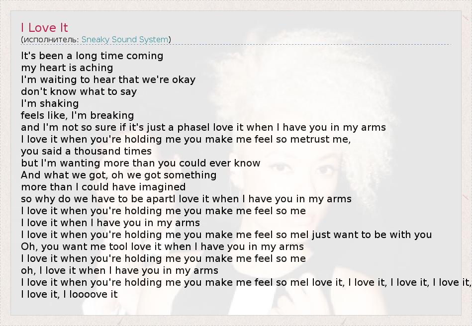 It's been a long time coming my heart is aching I'm waiting to hear that we're okay don't know what to say I'm shaking feels like, I'm breaking and I'm not so sure if it's just a phaseI love it when I have you in my arms I love it when you're holding me you make me feel so metrust me, you said a thousand times but I'm wanting more than you could ever know And what we got, oh we got something more than I could have imagined so why do we have to be apartI love it when I have you in my arms I love it when you're holding me you make me feel so me I love it when I have you in my arms I love it when you're holding me you make me feel so meI just want to be with you Oh, you want me tooI love it when I have you in my arms I love it when you're holding me you make me feel so me oh, I love it when I have you in my arms I love it when you're holding me you make me feel so meI love it, I love it, I love it, I love it, I love it, I loooove it